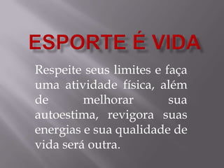 Este documento discute a importância da atividade física na aprendizagem e qualidade de vida. Ele foi elaborado por Donizeti Aparecido Fragoso para conscientizar sobre os benefícios dos projetos esportivos, como a liberação de endorfina, melhoria da autoestima e energia.