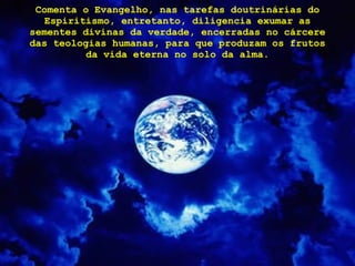 Este documento discute como o Espiritismo aborda o Evangelho, enfatizando as sementes divinas da verdade contidas nele, mas elucidando que Cristo não usufruiu de facilidades e sim obedeceu a Deus como humilde servidor. Também explica que o céu não é um lugar privilegiado, mas o espaço onde mundos evoluem sob leis divinas, e que anjos são espíritos que adquiriram sabedoria através do esforço.