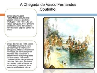O documento descreve a história colonial do Espírito Santo, começando com a chegada de Vasco Fernandes Coutinho em 1535. Detalha os ataques indígenas aos colonizadores, a fundação da Vila de Vitória em 1551 e seu desenvolvimento posterior. Também discute a busca por esmeraldas, o comércio de farinha com o Norte e o papel de São Mateus na história da região.