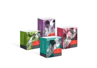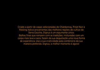 O documento descreve o novo conceito e embalagem desenvolvido para o espumante Dignus. O conceito visa desmistificar o espumante como bebida para ocasiões especiais e torná-lo acessível para qualquer momento. A nova embalagem usa um design sofisticado de mosaico de triângulos para comunicar o perfil moderno da marca enquanto mantém o preço acessível.