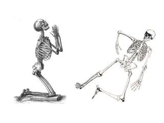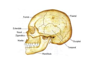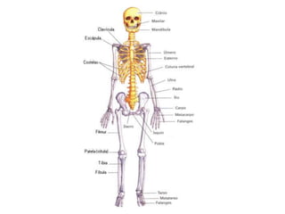 O documento descreve as principais partes do esqueleto humano, incluindo ossos longos, curtos e chatos, e as regiões do corpo como a cabeça, tórax, bacia e extremidades. Também explica os tipos de articulações, como fibrosas, cartilaginosas e sinoviais, e as diferenças entre ossos masculinos e femininos.