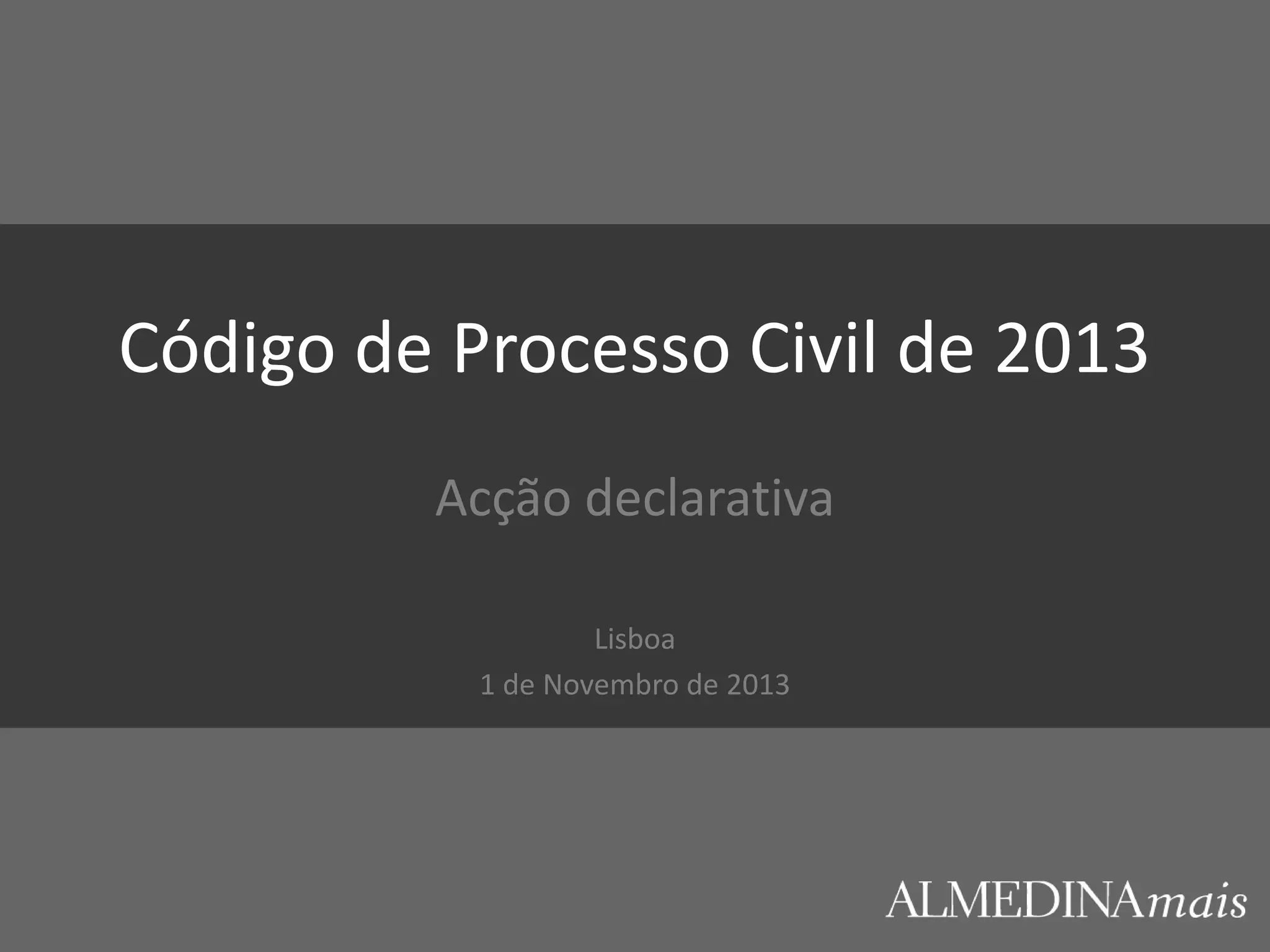O documento descreve os principais aspectos da tramitação processual de uma ação declarativa segundo o Código de Processo Civil de 2013, incluindo as etapas da petição inicial, contestação, audiência prévia, despacho saneador, identificação do objeto do litígio, provas, audiência final e sentença.