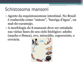 O documento descreve o ciclo de vida do Schistosoma mansoni, o agente causador da esquistossomose intestinal no Brasil. O ciclo envolve estágios como ovo, miracídio, esporocisto e cercária no caramujo, e os adultos macho e fêmea nos vasos sanguíneos do hospedeiro humano, onde os ovos são depositados e podem causar danos.