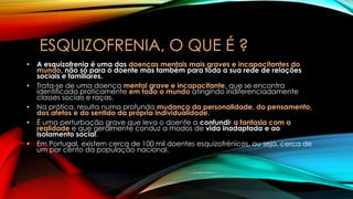 O documento descreve os sintomas, causas e tratamento da esquizofrenia. A esquizofrenia é uma doença mental grave que causa mudanças na personalidade, pensamento e isolamento social. Os sintomas incluem alucinações, delírios e alterações de humor, e geralmente surgem entre os 16 e 25 anos. O diagnóstico é feito por um psiquiatra e o tratamento envolve medicamentos antipsicóticos e terapia.