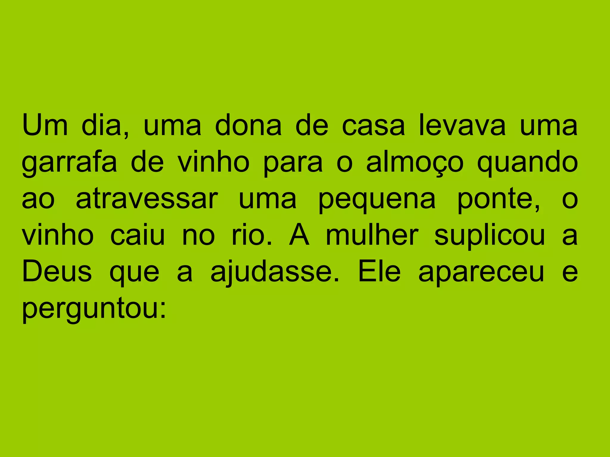 Uma mulher pede ajuda a Deus depois que seu vinho cai no rio. Deus tira três vinhos caros do rio, mas a mulher admite que só o último é dela por ser sincera. Mais tarde, quando o marido da mulher cai no rio, Deus tira três homens bonitos e a mulher diz que o primeiro é o marido dela para não ficar com os três.