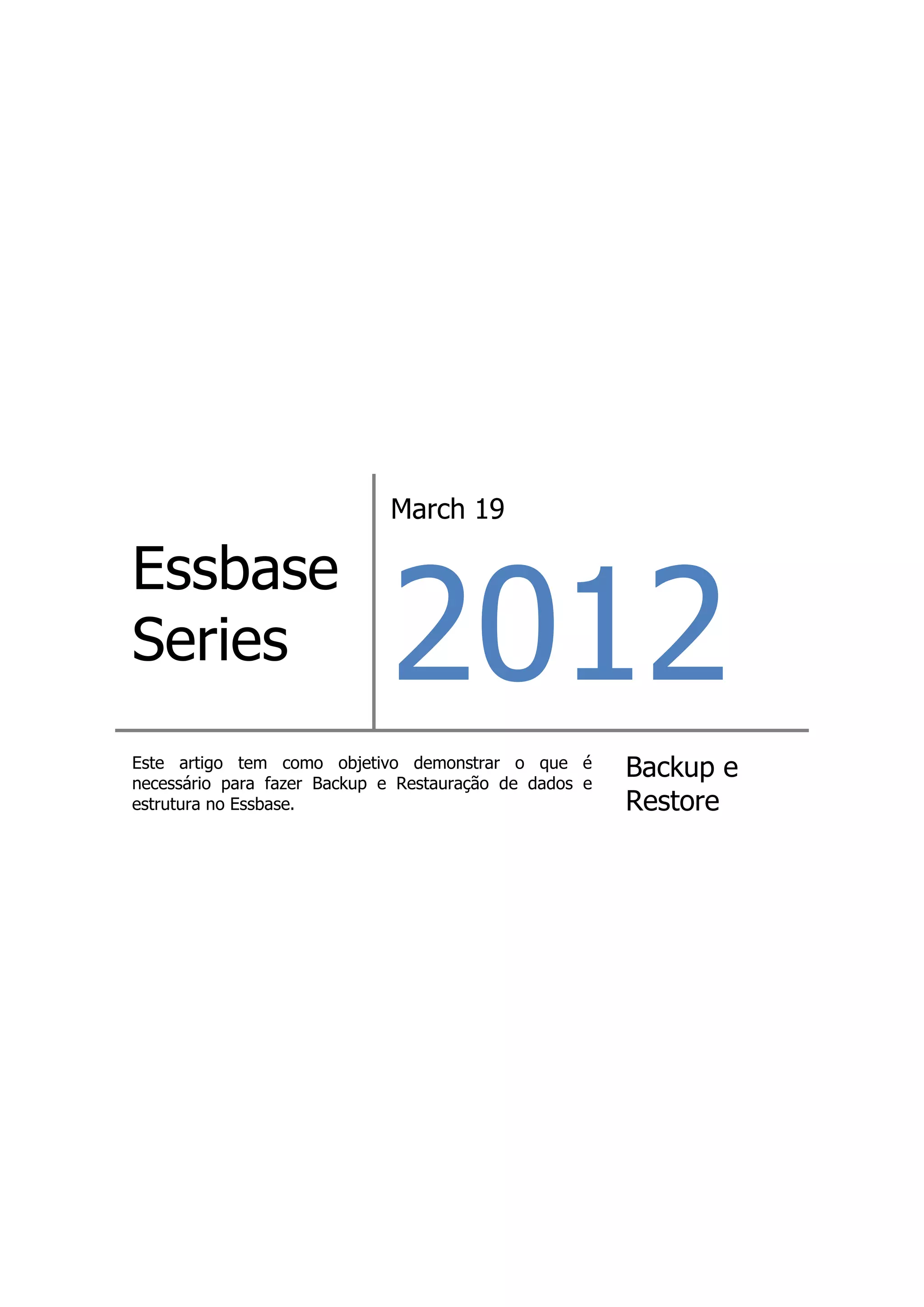 Este documento fornece instruções sobre como fazer backup e restauração de dados e estrutura no Essbase. Ele explica os dois métodos de backup - preparando os arquivos para cópia no sistema de arquivos ou exportando os dados para arquivos de texto. Além disso, lista os arquivos importantes para backup e fornece detalhes sobre como colocar o banco de dados em modo leitura para backup e restaurá-lo.