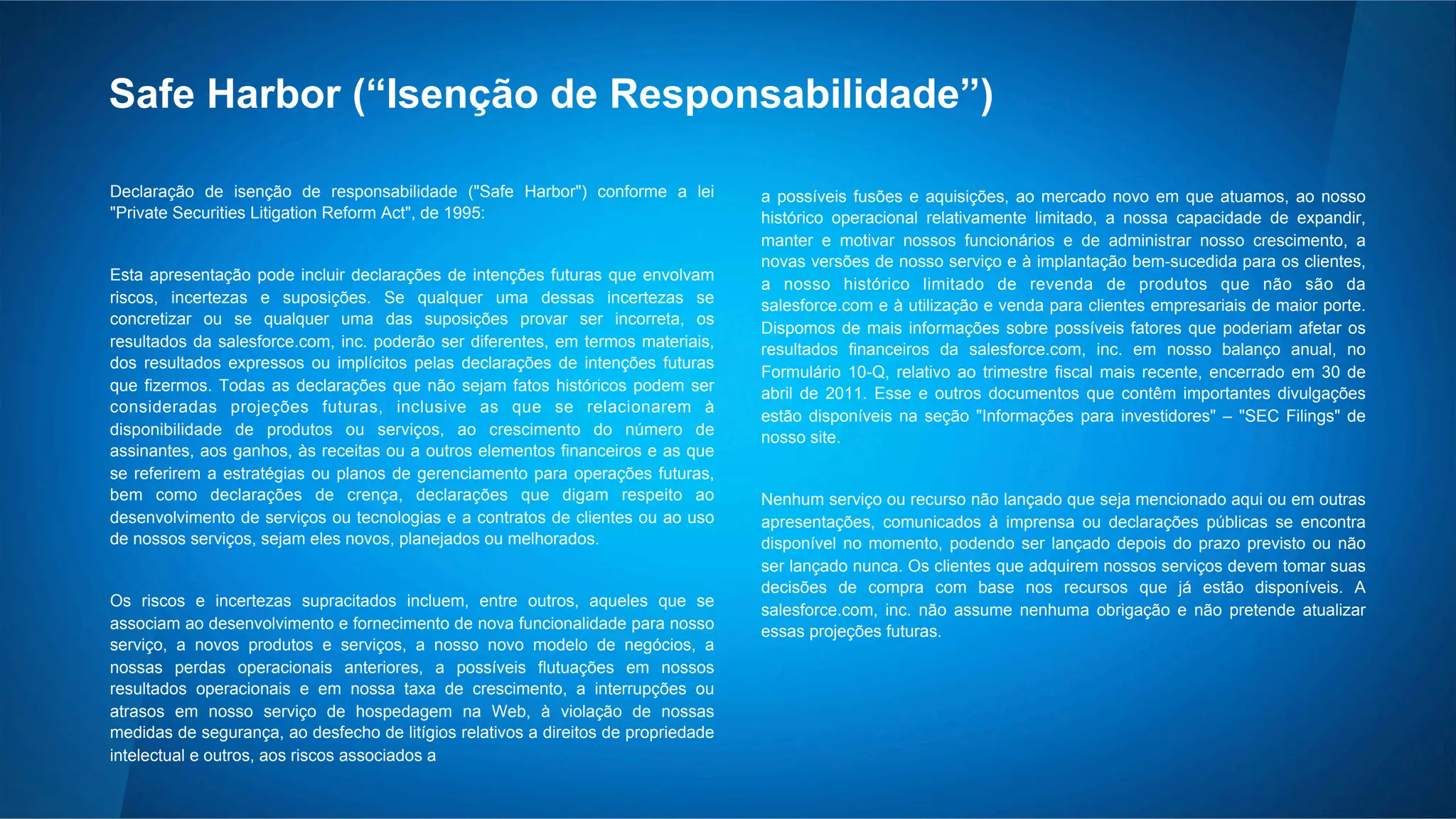 O documento descreve uma declaração de isenção de responsabilidade de uma empresa sobre declarações futuras, notando que resultados reais podem diferir devido a incertezas e riscos inerentes. Ele também lista vários riscos e incertezas que podem afetar os resultados financeiros reportados, como desenvolvimento de novos produtos e serviços.