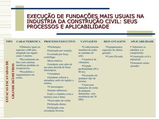 O documento descreve os tipos mais comuns de fundações usadas na indústria da construção civil, seus processos de execução e aplicabilidade. Entre os tipos descritos estão estacas escavadas de grande diâmetro, paredes diafragma e estacas barrete, estacas de madeira e estacas metálicas. Detalha os processos de perfuração, armadura e concretagem para estacas escavadas, e os processos de escavação, tubos ou juntas e concretagem para paredes diafragma.