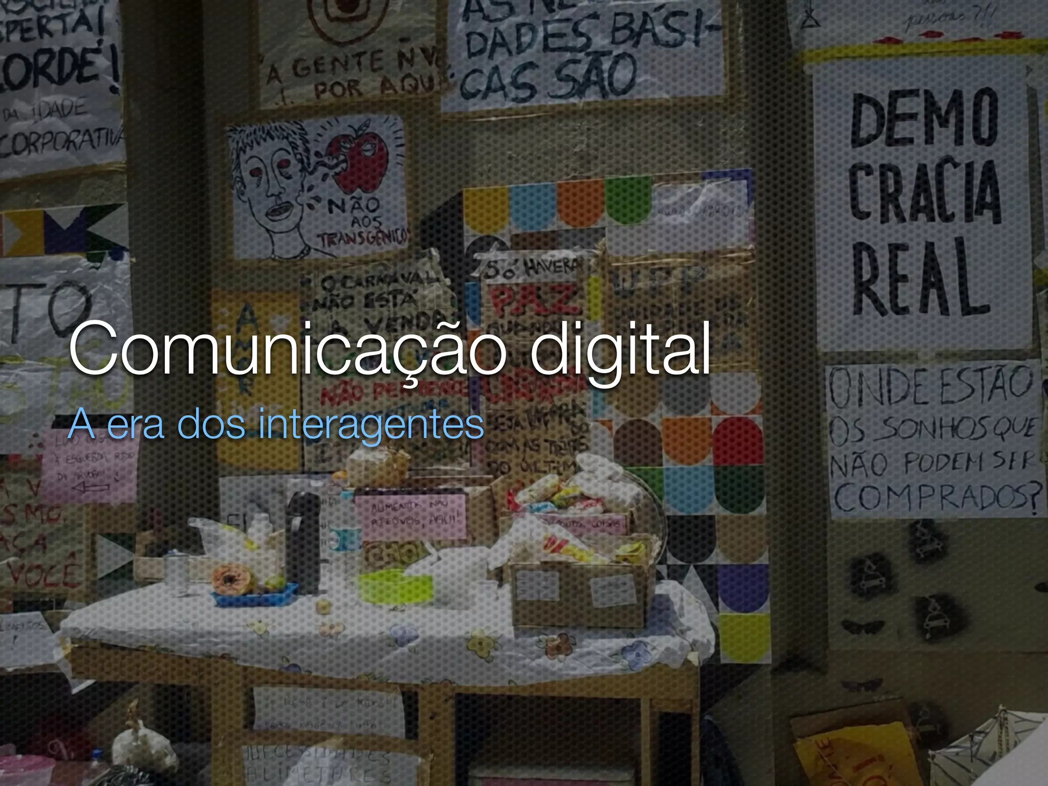 O documento discute a comunicação digital, comparando a internet com a mídia tradicional. A internet é descrita como um sistema social heterogêneo onde as mensagens são permanentes e há muitos interagentes em movimento. Os usuários da internet não são mais apenas espectadores passivos. As redes sociais permitem que as pessoas se conectem e trabalhem juntas para causas coletivas.