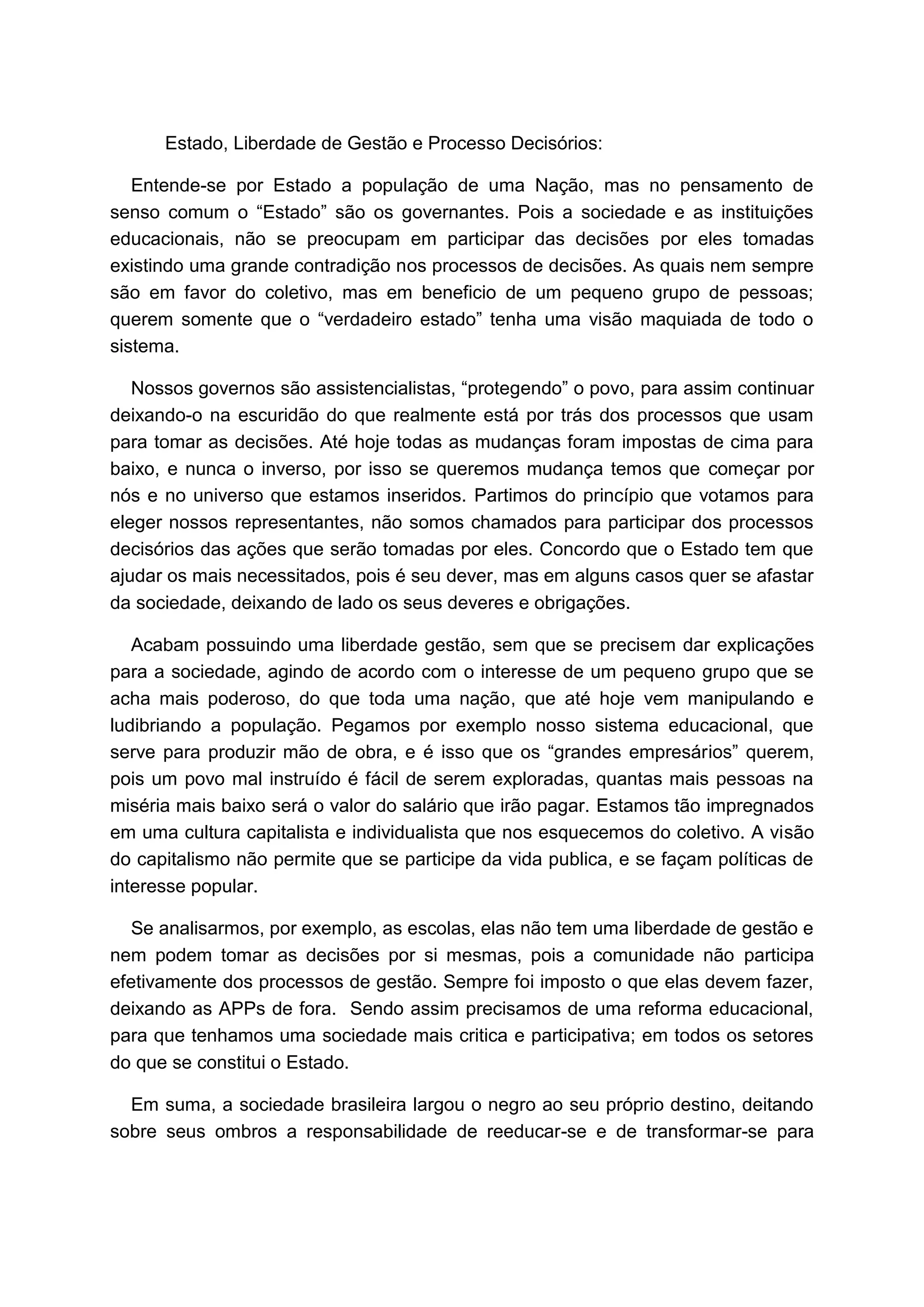 O documento discute a falta de participação da sociedade nos processos decisórios do Estado, que acabam beneficiando pequenos grupos em detrimento do coletivo. Argumenta que as instituições educacionais servem para produzir mão de obra barata para os empresários, em vez de formar cidadãos críticos. Defende uma reforma educacional que dê mais liberdade de gestão às escolas e inclua a comunidade nos processos de decisão.
