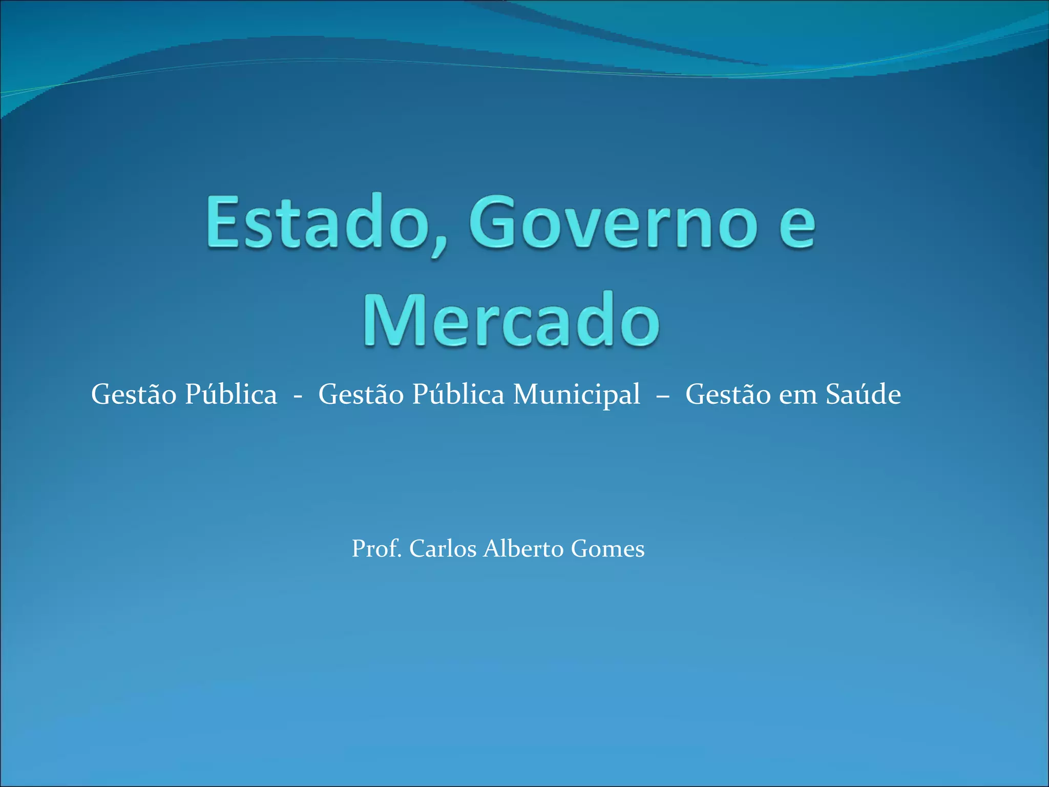 O documento discute a evolução histórica do pensamento sobre o papel do Estado, Governo e Mercado na sociedade. Apresenta as visões de pensadores liberais como Adam Smith e Marxistas como Karl Marx, além de John Maynard Keynes que defendia um papel interventor do Estado na economia. Também discute formas de governo e a atuação do Estado no Brasil no século XX.