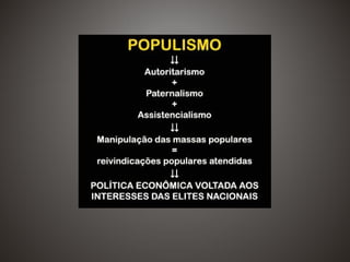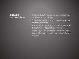O documento descreve a evolução do Estado e das políticas sociais no Brasil desde 1937, quando Vargas estabeleceu um governo autoritário. A CLT de 1943 criou proteções iniciais para trabalhadores, mas muitos ficaram excluídos. Políticas populistas entre 1945-1964 priorizaram setores eleitorais, não universalizando benefícios. O golpe de 1964 reprimiu movimentos sociais. A constituição de 1988 consolidou direitos universais, embora especialistas questionem se o Brasil teve um verdadeiro "welfare state".