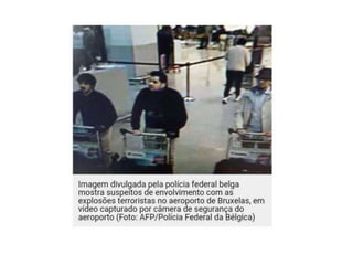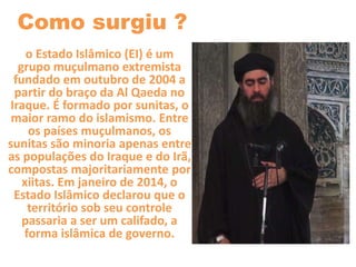 O documento descreve o Estado Islâmico (EI), um grupo extremista sunita fundado no Iraque em 2004. O EI controla território na Síria e Iraque rico em petróleo, financiando-se com impostos, roubos e contrabando. O grupo é conhecido por executar quem se recusa a se converter ao islamismo sunita.