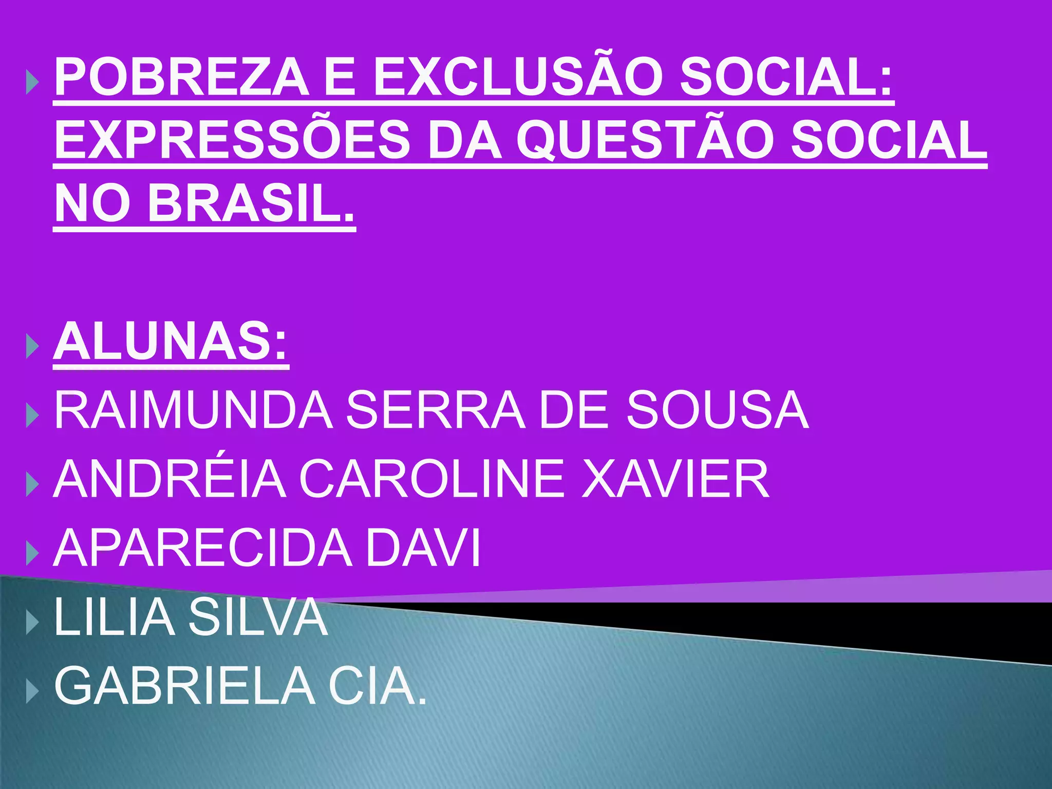 O documento discute a pobreza e exclusão social no Brasil, onde a riqueza é centralizada em poucos enquanto a maioria vive na precariedade sem acesso a educação, saúde e trabalho. Isso cria classes sociais desiguais e leva os mais pobres à subalternidade, dependendo da boa vontade de outros em vez de terem seus direitos garantidos. O estado adota uma visão mínima, tratando a questão social como caridade em vez de direito universal.