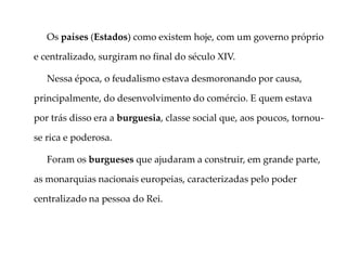 O documento descreve a formação dos Estados modernos na Europa a partir do século XIV, quando o feudalismo estava em declínio e surgia a burguesia. A centralização do poder político nos monarcas nacionais permitiu o fortalecimento dos Estados e do comércio, com teóricos como Bodin, Hobbes e Bossuet justificando o absolutismo real.