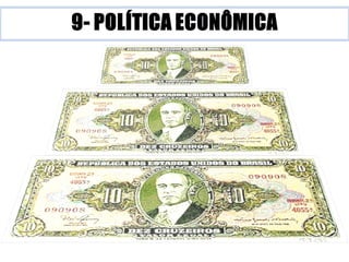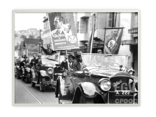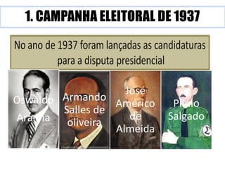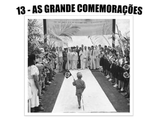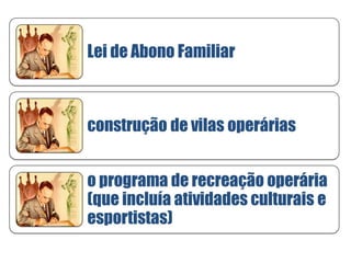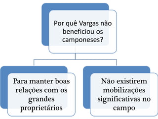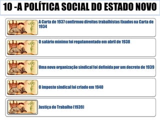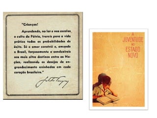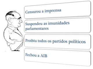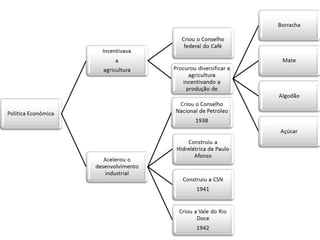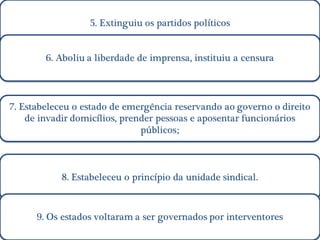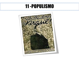O documento descreve o regime populista de Getúlio Vargas no Brasil entre 1930 e 1945. Vargas implementou políticas para ganhar apoio popular, como direitos trabalhistas e programas sociais, ao mesmo tempo em que restringiu liberdades civis e proibiu a oposição política para manter o controle autoritário. Seu governo combinou elementos populistas e autoritários para consolidar o poder do Estado e promover a industrialização do país.