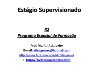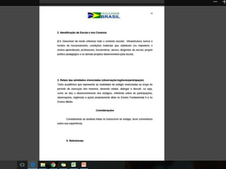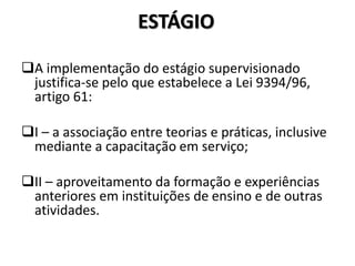 O documento fornece informações sobre os requisitos e procedimentos para a realização do estágio supervisionado. O estágio deve ser de 300 horas, incluindo 270 horas de atividades como observação, participação e regência em escolas de ensino fundamental e médio, e 30 horas para elaboração do relatório final. O estágio tem como objetivo associar teoria e prática e capacitar os estagiários para a docência.