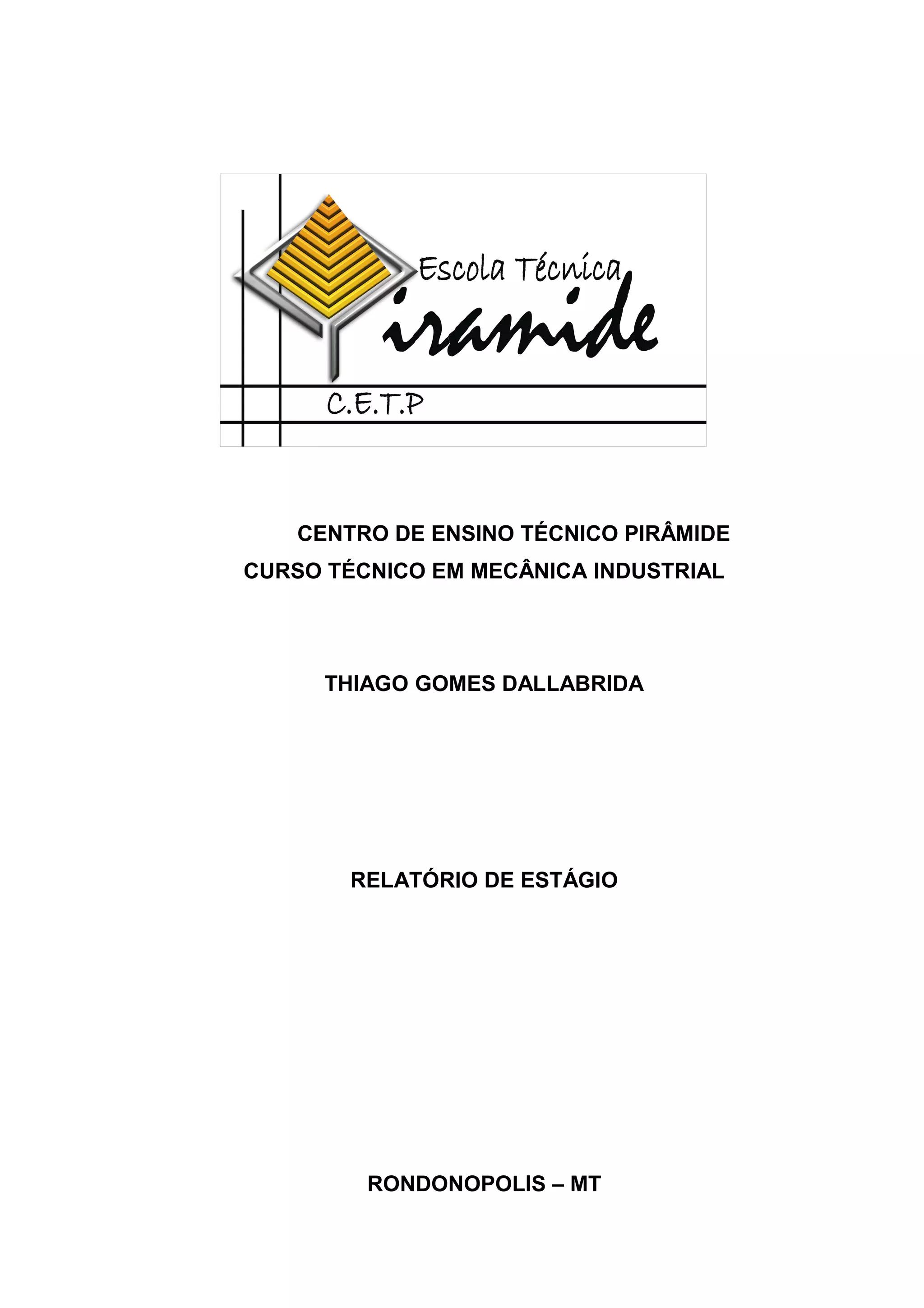 O relatório descreve o estágio de Thiago Gomes Dallabrida realizado na empresa Sabin Mecânica e Auto Elétrica em Rondonópolis entre setembro de 2013 e janeiro de 2014. O relatório detalha as atividades de manutenção mecânica preventiva e corretiva realizadas, como troca de óleo, filtros e rolamentos, além dos equipamentos e ferramentas utilizados como parafusadeiras, furadeiras e instrumentos de medição.