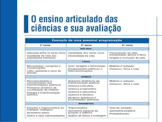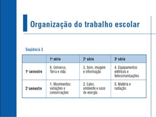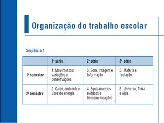 Foram privilegiados seistemas estruturadores com abrangência para organizar o ensino de Física: 1. Movimentos: variações e conservações 2. Calor, ambiente e usos de energia 3. Som, imagem e informação 4. Equipamentos elétricos e Telecomunicações 5. Matéria e radiação 6. Universo, Terra e vida