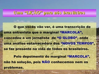 Uma entrevista do líder criminoso Marcola é resumida, onde ele descreve a ascensão do tráfico de drogas no Brasil, criticando a inação do governo em resolver os problemas sociais e afirmando que não há mais solução para a situação, já que estão todos no "inferno".