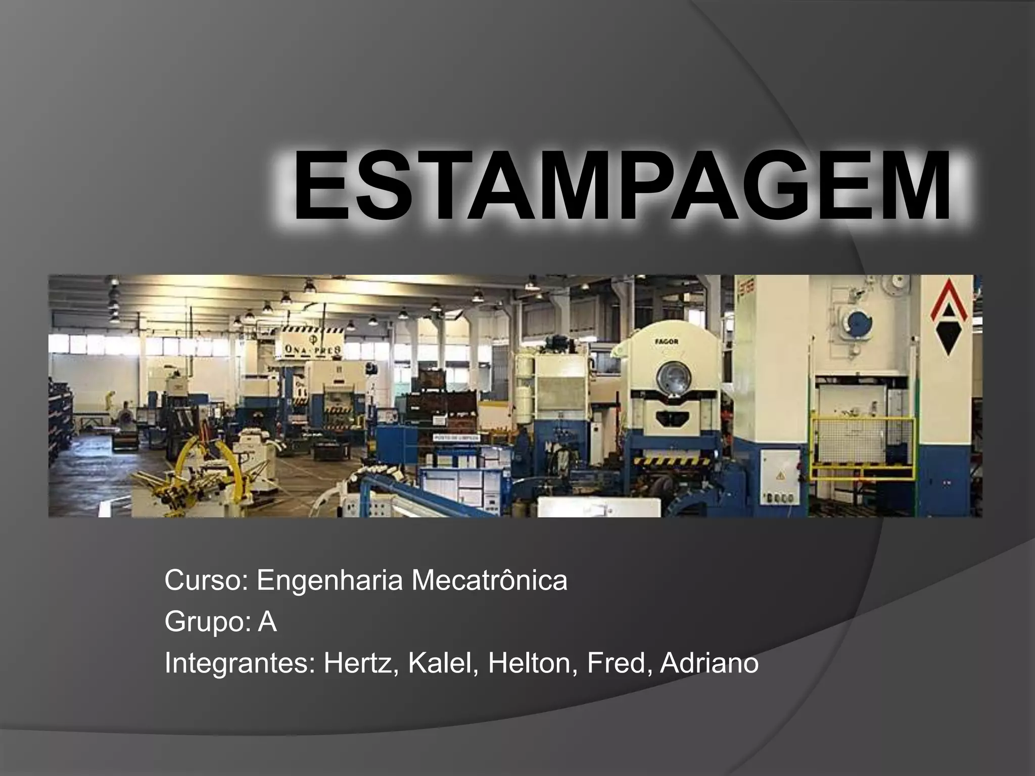 O documento apresenta os processos da estampagem, incluindo corte de chapas, conformação mecânica e estampagem profunda. A estampagem é o processo de fabricação que utiliza o corte ou deformação de chapas em prensagem. Exemplos de processos de conformação mecânica incluem dobramento, rebordamento e enrolamento.
