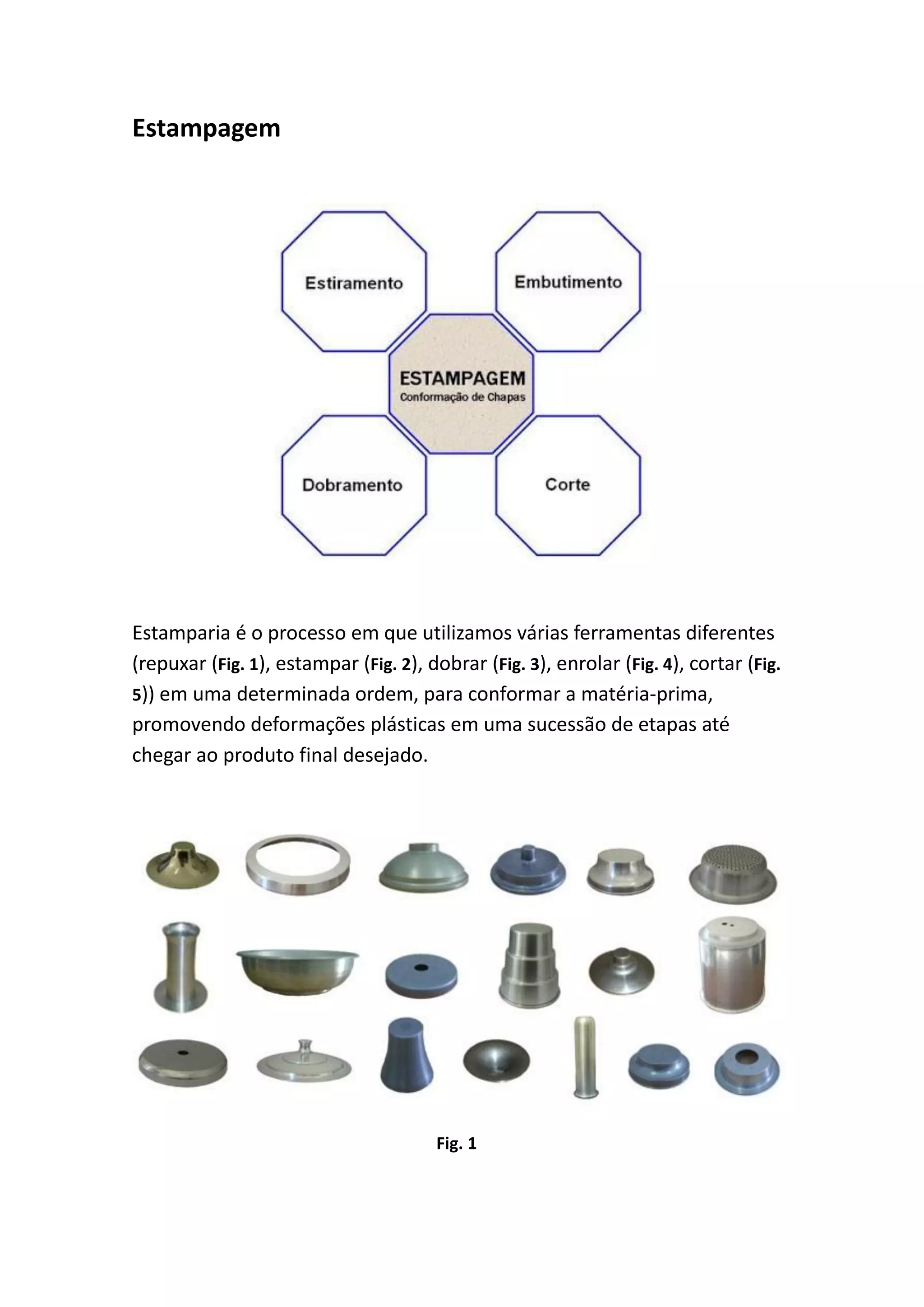 O documento descreve processos de fabricação de metais como estampagem, injeção, fundição e acabamentos superficiais. É descrito o processo de estampagem que usa ferramentas para deformar plasticamente a matéria-prima até a forma final desejada. Também são descritos processos de fabricação como injeção de metais fundidos em moldes e propriedades de ligas metálicas comuns como aços e latões.