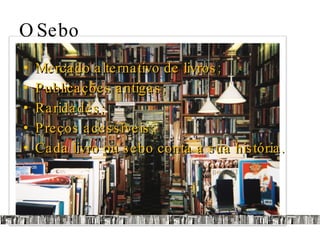 O documento descreve um portal de livros usados chamado Estante Virtual, que reúne vários sebos para aumentar o acervo disponível. Seus objetivos são fortalecer a imagem do site como aliado dos leitores, aumentar a presença da marca por meio das redes sociais e utilizar as peculiaridades de cada rede para aproximar o público.
