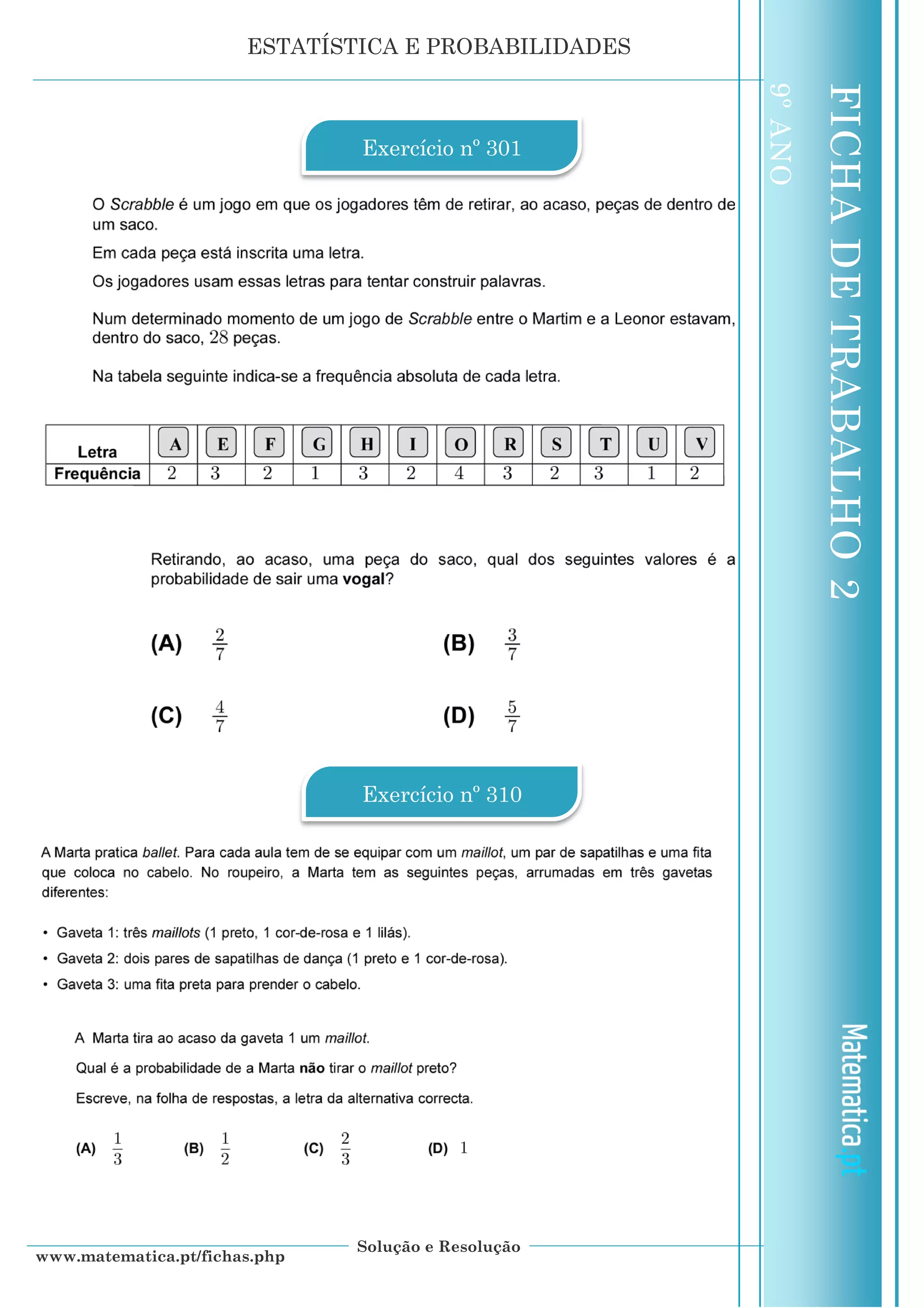 Este documento lista exercícios de estatística e probabilidades para o 9o ano. Inclui o exercício no 301 e o exercício no 310 como exemplos de problemas a serem resolvidos.