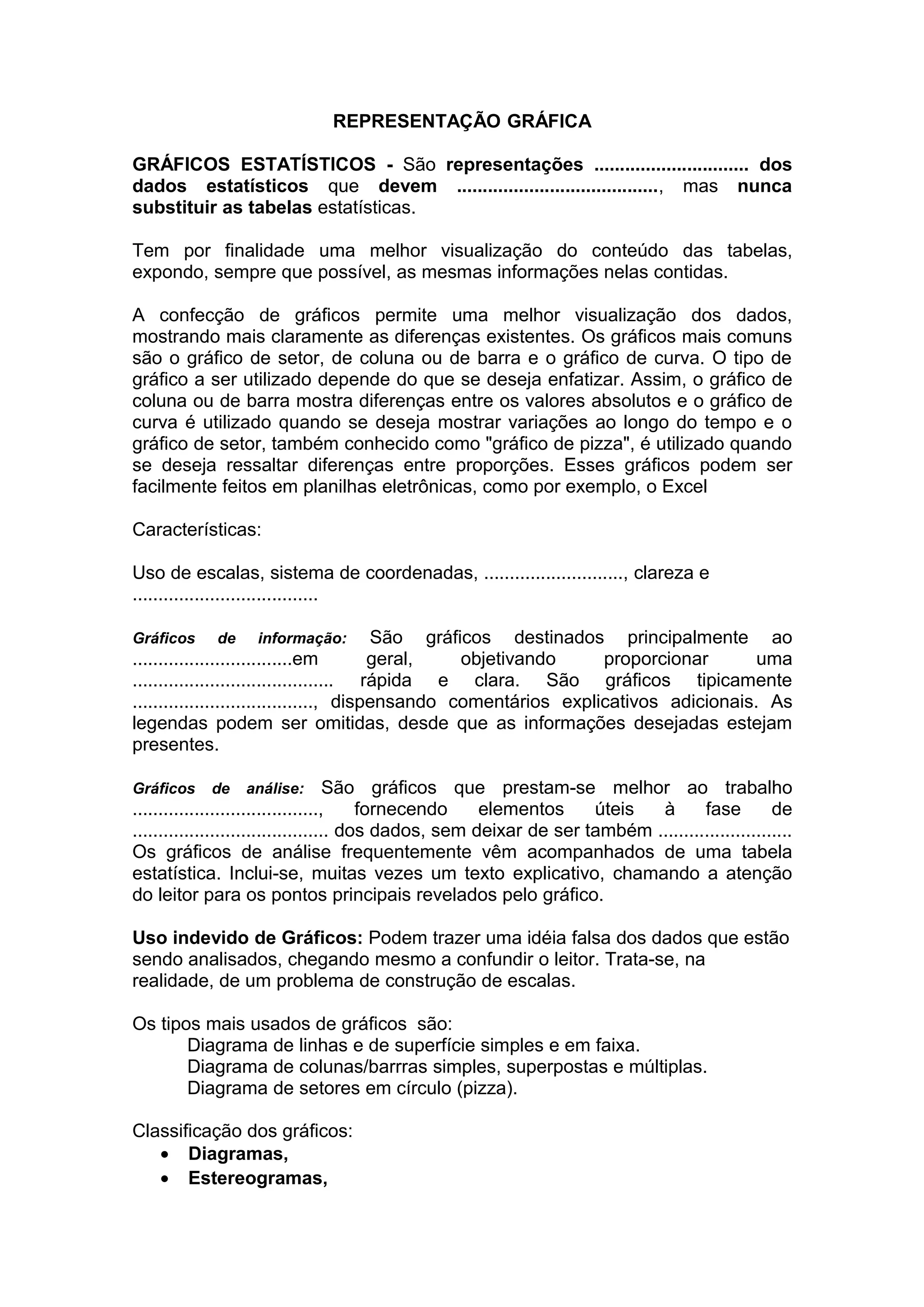 O documento discute diferentes tipos de gráficos estatísticos, como gráficos de linha, barras, setores e suas aplicações. Ele explica como cada gráfico é usado para enfatizar diferentes aspectos dos dados e deve ser escolhido de acordo com o objetivo. O documento também discute como fazer gráficos corretamente para não distorcer a informação.