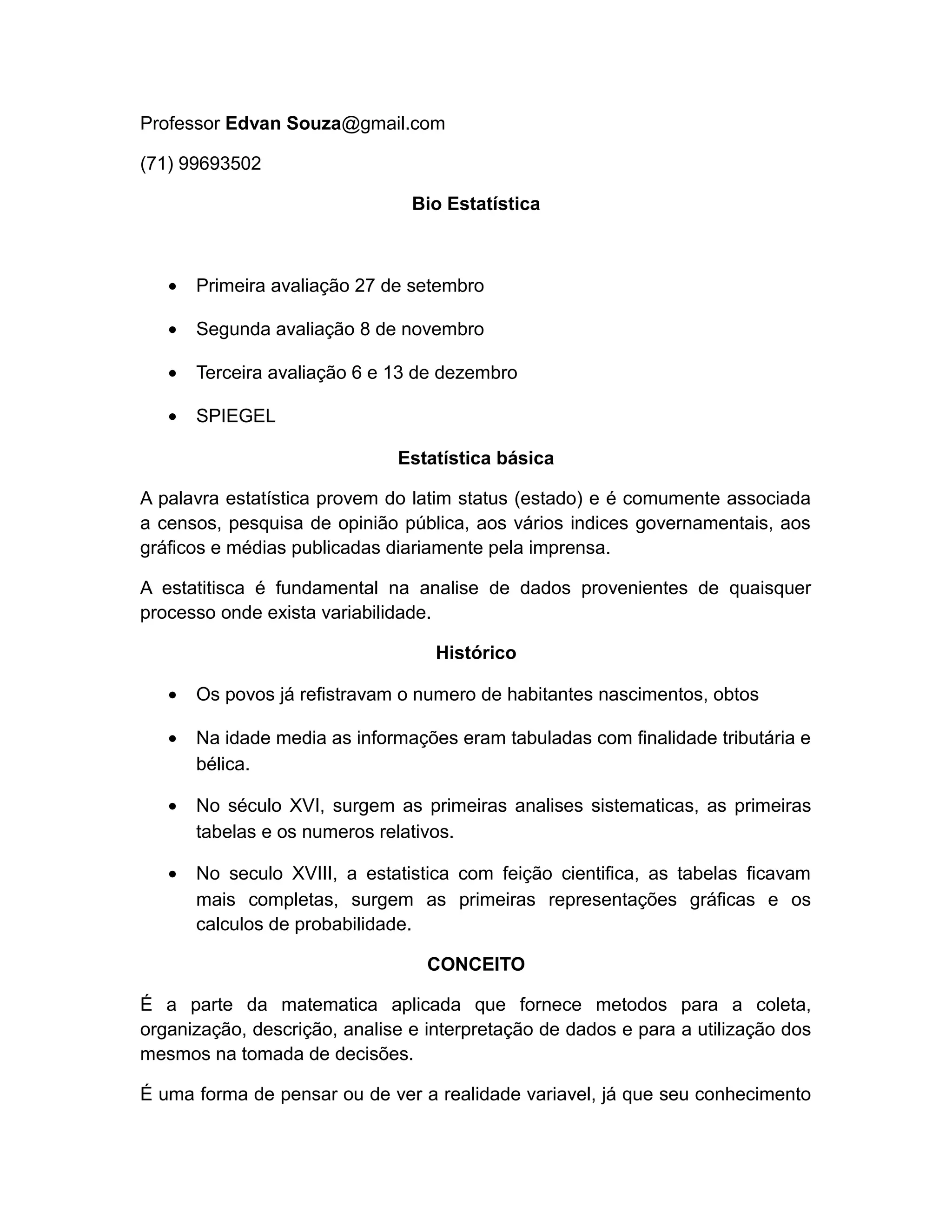O documento fornece informações sobre um curso de estatística básica, incluindo três datas de avaliação, conceitos fundamentais de estatística, tipos de coleta de dados, apresentação de dados e definições básicas de termos estatísticos.