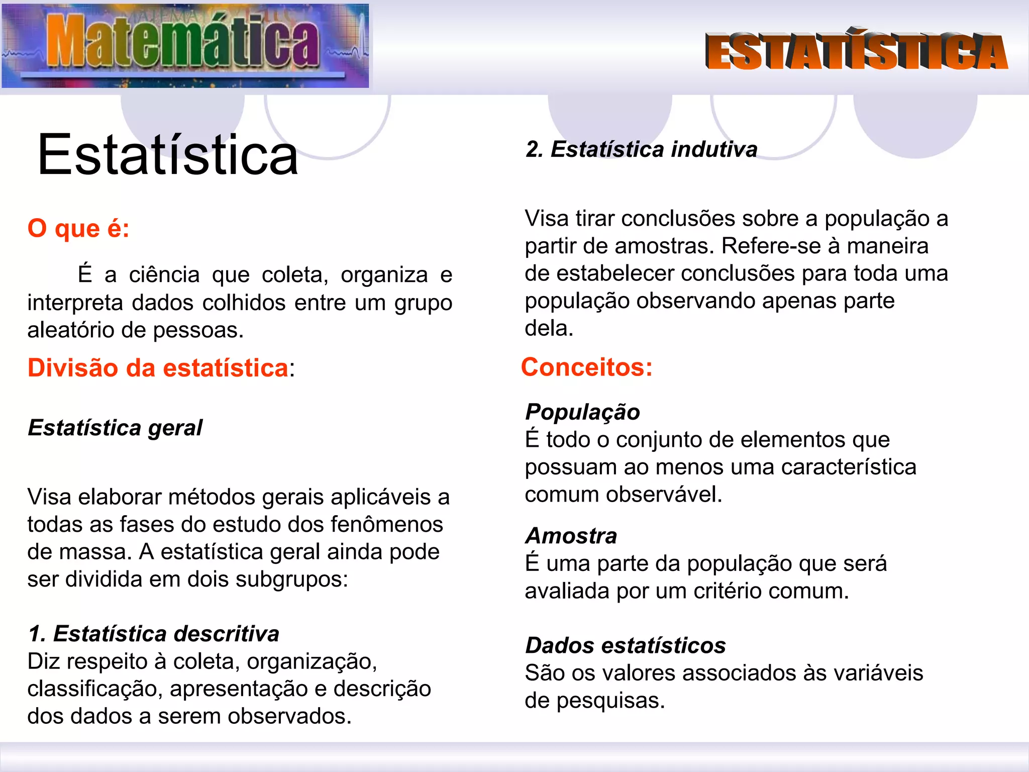 3) A estatística geral inclui estatística descritiva, que descreve dados, e estatística indutiva, que tira conclusões sobre populações a partir de amostras.