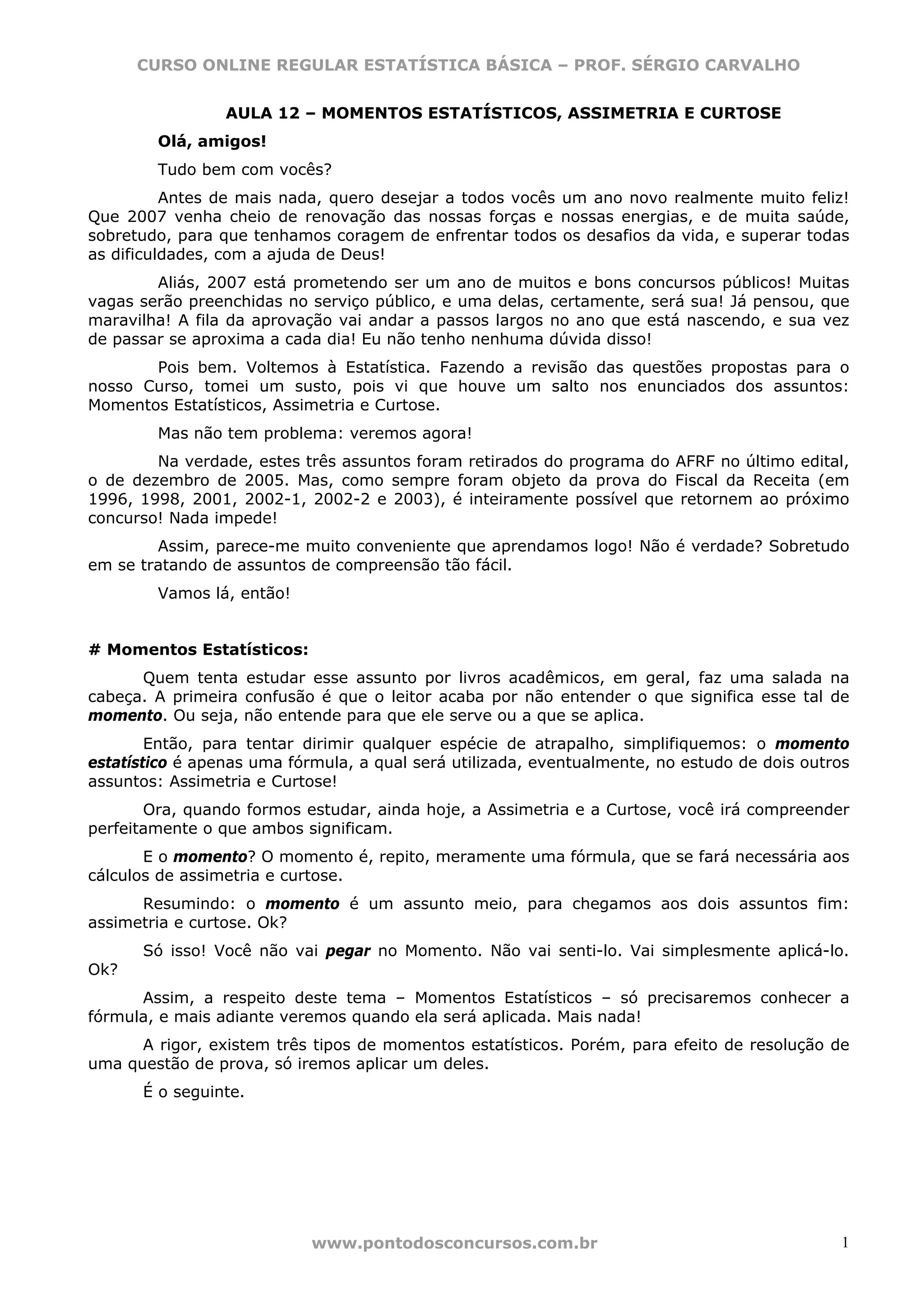 Este documento apresenta uma aula sobre momentos estatísticos, assimetria e curtose. Nele, o professor explica que: