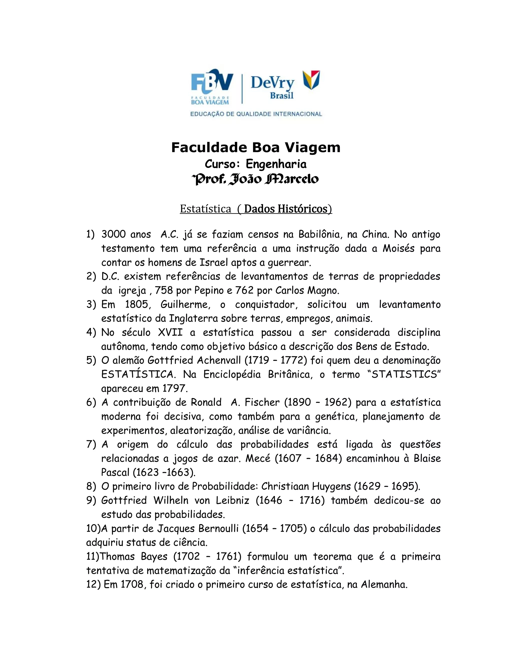 O documento descreve a história da estatística desde os primeiros censos na Babilônia e China há 3000 anos até o desenvolvimento moderno da teoria das probabilidades e da estatística inferencial. Também menciona brevemente marcos no Brasil como o primeiro censo nacional em 1872 e a criação do IBGE em 1938.