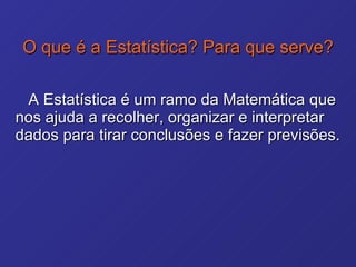 Este documento explica conceitos básicos de estatística, incluindo: (1) estatística serve para coletar, organizar e interpretar dados para tirar conclusões e previsões; (2) população e amostra são conjuntos de elementos estudados; (3) variáveis podem ser qualitativas ou quantitativas. Ele também apresenta um exemplo de construção de tabela de frequências e gráfico de barras para organizar dados sobre número de irmãos de alunos.