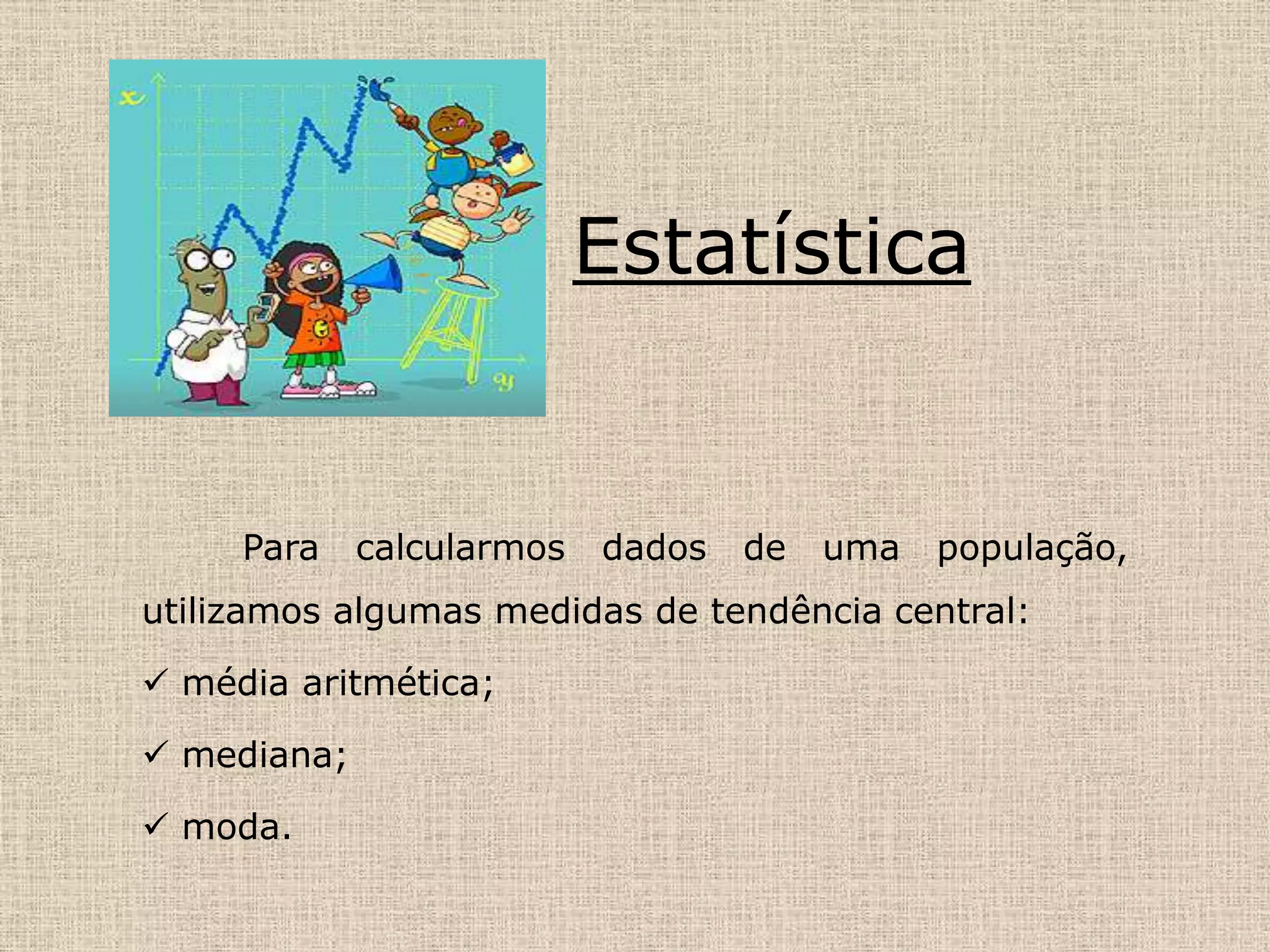 Este documento discute medidas de tendência central para analisar dados de uma população. Ele explica o que são média aritmética, mediana e moda, e fornece exemplos de como calculá-las. A média aritmética é a soma dos números dividida pelo total de itens. A mediana é o valor central quando os itens são ordenados. A moda é o item que aparece com mais frequência no conjunto de dados.