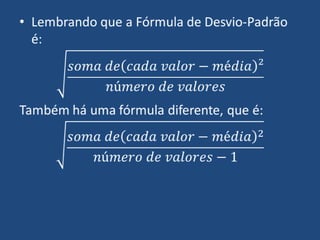 O documento apresenta conceitos estatísticos como média, mediana, desvio-padrão, tabelas de frequência e histogramas. Explica como calcular a frequência relativa usando um exemplo de preços de restaurantes de lámen e como representar esses dados em um histograma. Também discute a diferença entre média e mediana e como o desvio-padrão mede a dispersão de valores em relação à média.