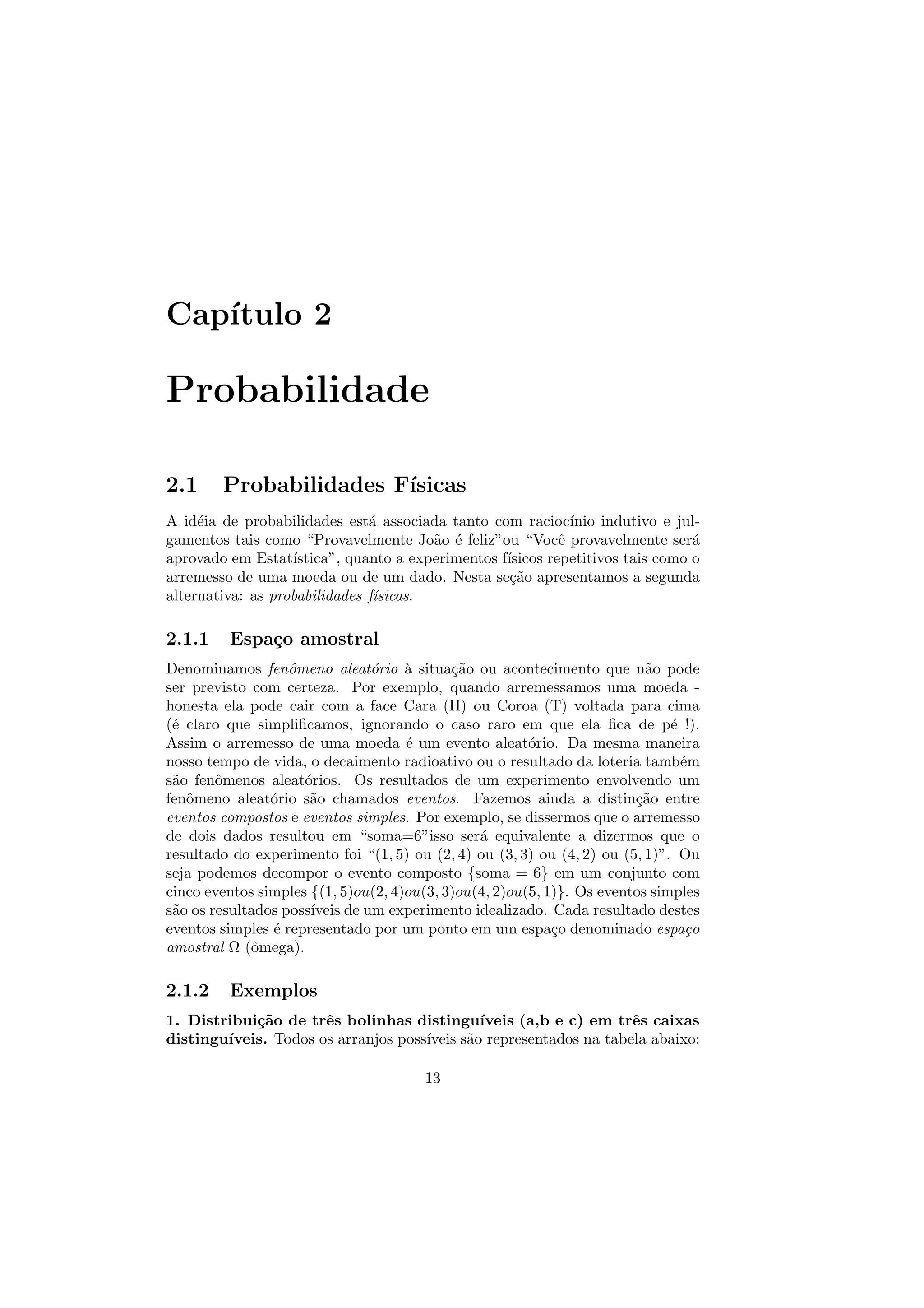 1) O documento descreve os conceitos básicos de probabilidade física, incluindo espaço amostral e eventos.