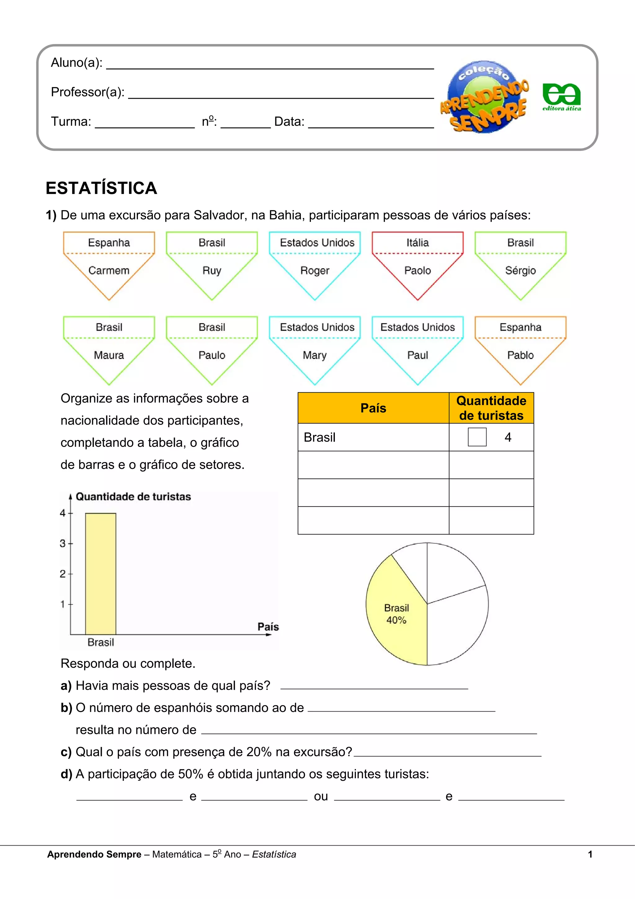 O documento apresenta três questões sobre estatística. A primeira trata de uma excursão com turistas de diferentes países, pedindo para organizar os dados em tabela e gráficos. A segunda analisa a produção mensal de uma fábrica de TVs no primeiro semestre. A terceira apresenta gráficos sobre o número de alunos em classes do 4o e 5o ano e pede para completar informações.