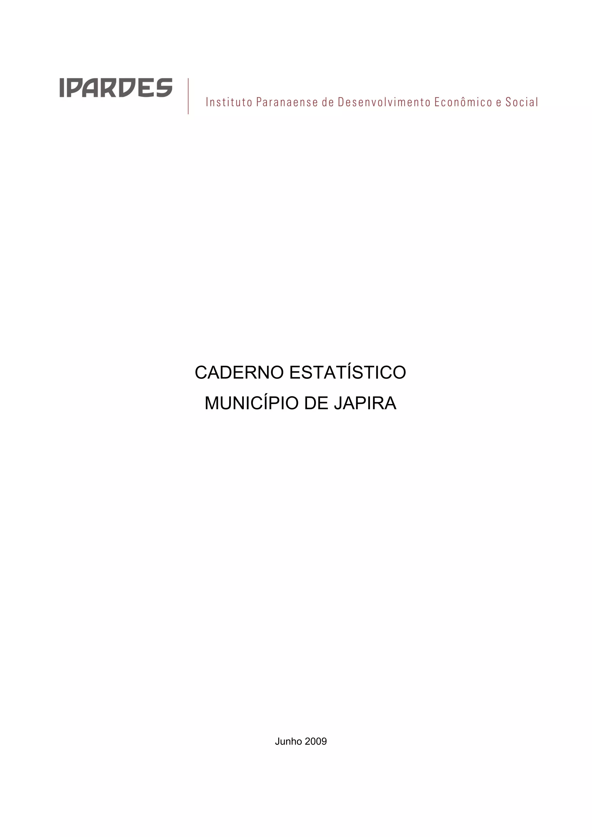 O documento fornece estatísticas sobre o município de Japira no Paraná, incluindo informações sobre demografia, agropecuária, educação, trabalho, finanças públicas e indicadores socioeconômicos.