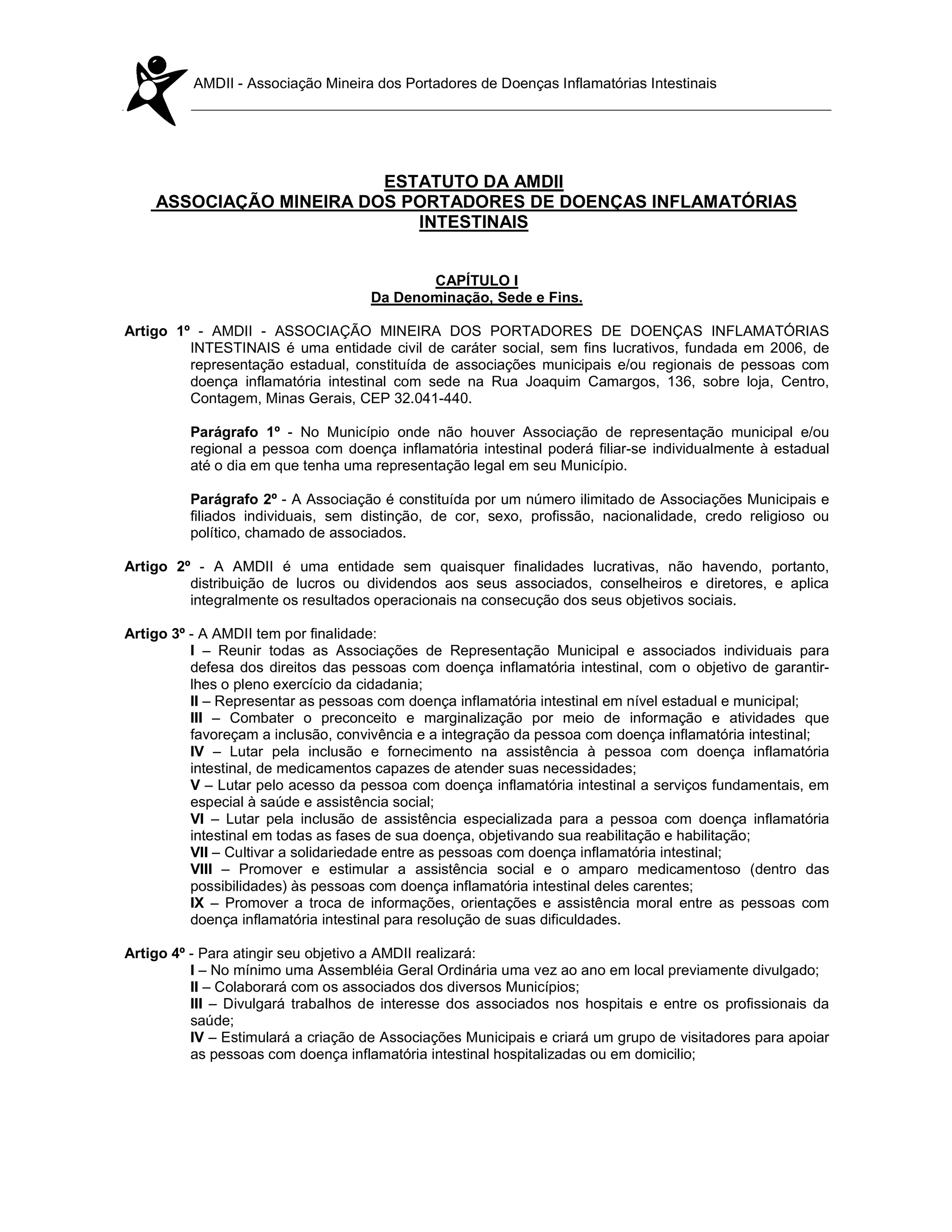 Este documento apresenta o estatuto da Associação Mineira dos Portadores de Doenças Inflamatórias Intestinais (AMDII). A AMDII é uma associação sem fins lucrativos fundada em 2006 para representar e defender os direitos de pessoas com doenças inflamatórias intestinais em Minas Gerais. O estatuto define a finalidade, estrutura, direitos e deveres da associação e de seus associados.