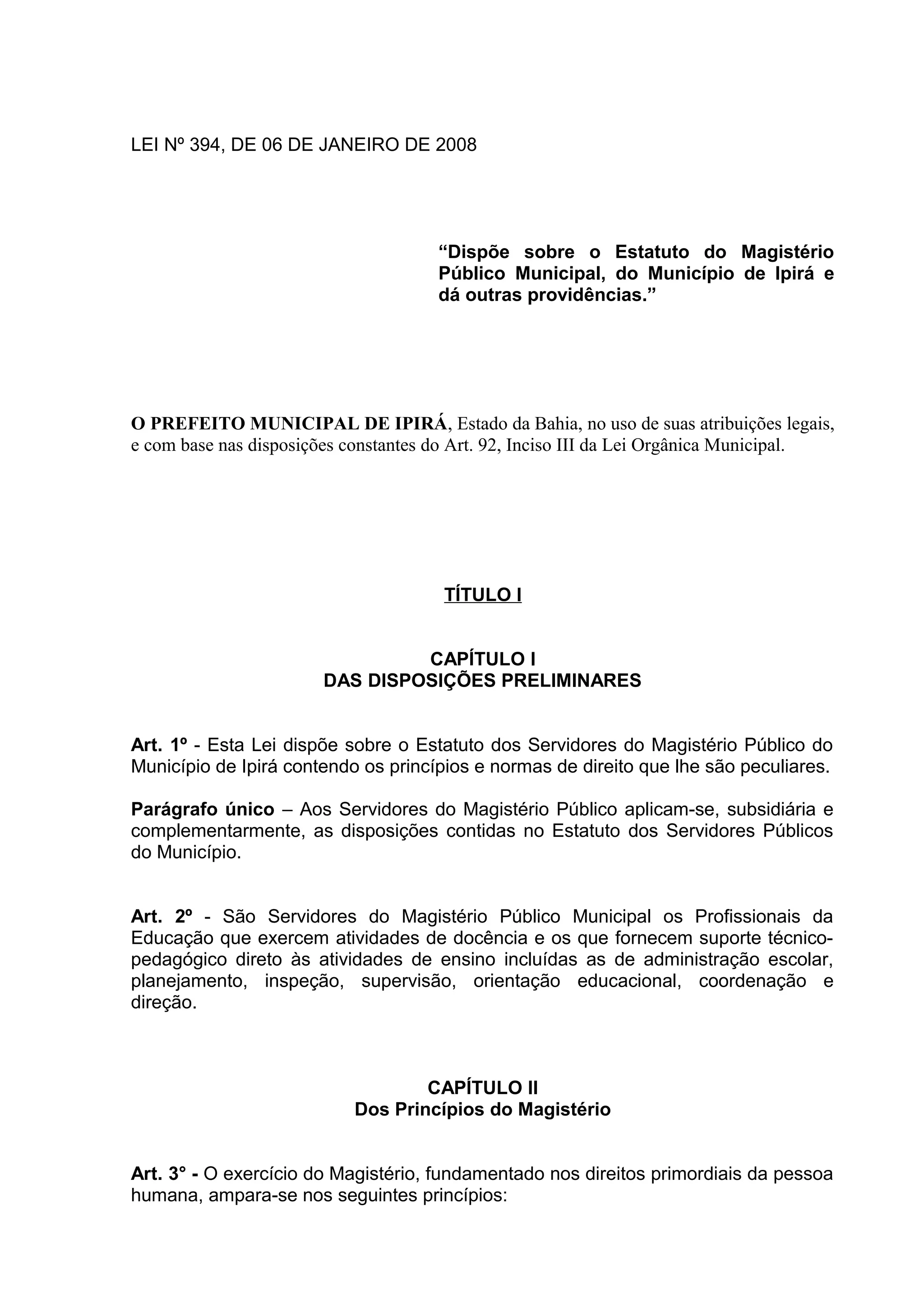 Este documento estabelece o Estatuto do Magistério Público Municipal de Ipirá, Bahia. Ele define os princípios, cargos e estrutura da carreira do magistério, incluindo professores, coordenadores pedagógicos e coordenadores técnico-pedagógicos. Além disso, trata da organização do concurso público para ingresso na carreira do magistério.