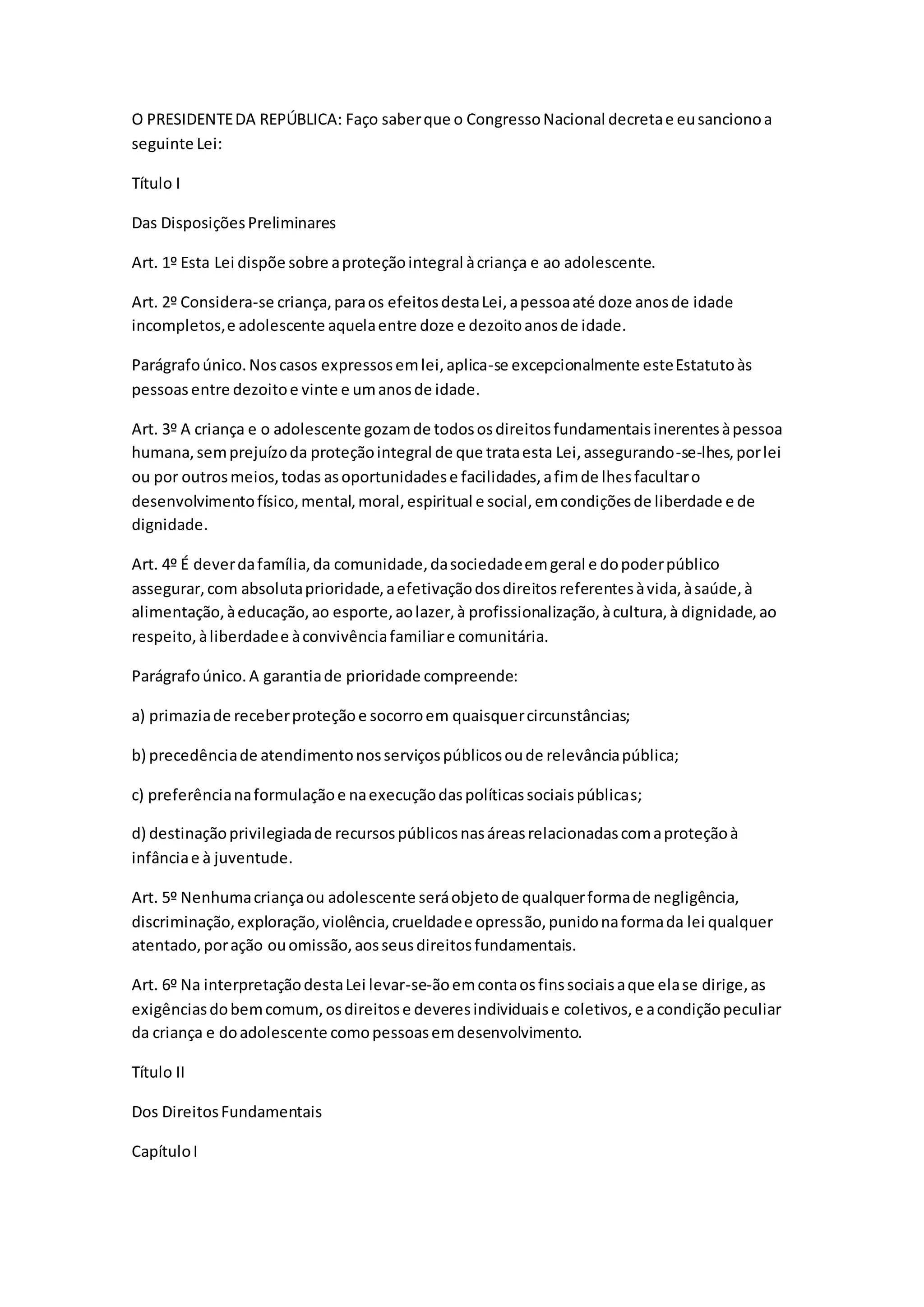Este documento apresenta os principais pontos da Lei no 8.069/90, que dispõe sobre a proteção integral à criança e ao adolescente. Ele estabelece os direitos fundamentais das crianças e adolescentes à vida, saúde, liberdade, respeito e dignidade. Também trata da convivência familiar e comunitária e do dever do poder público de garantir prioridade na efetivação desses direitos.