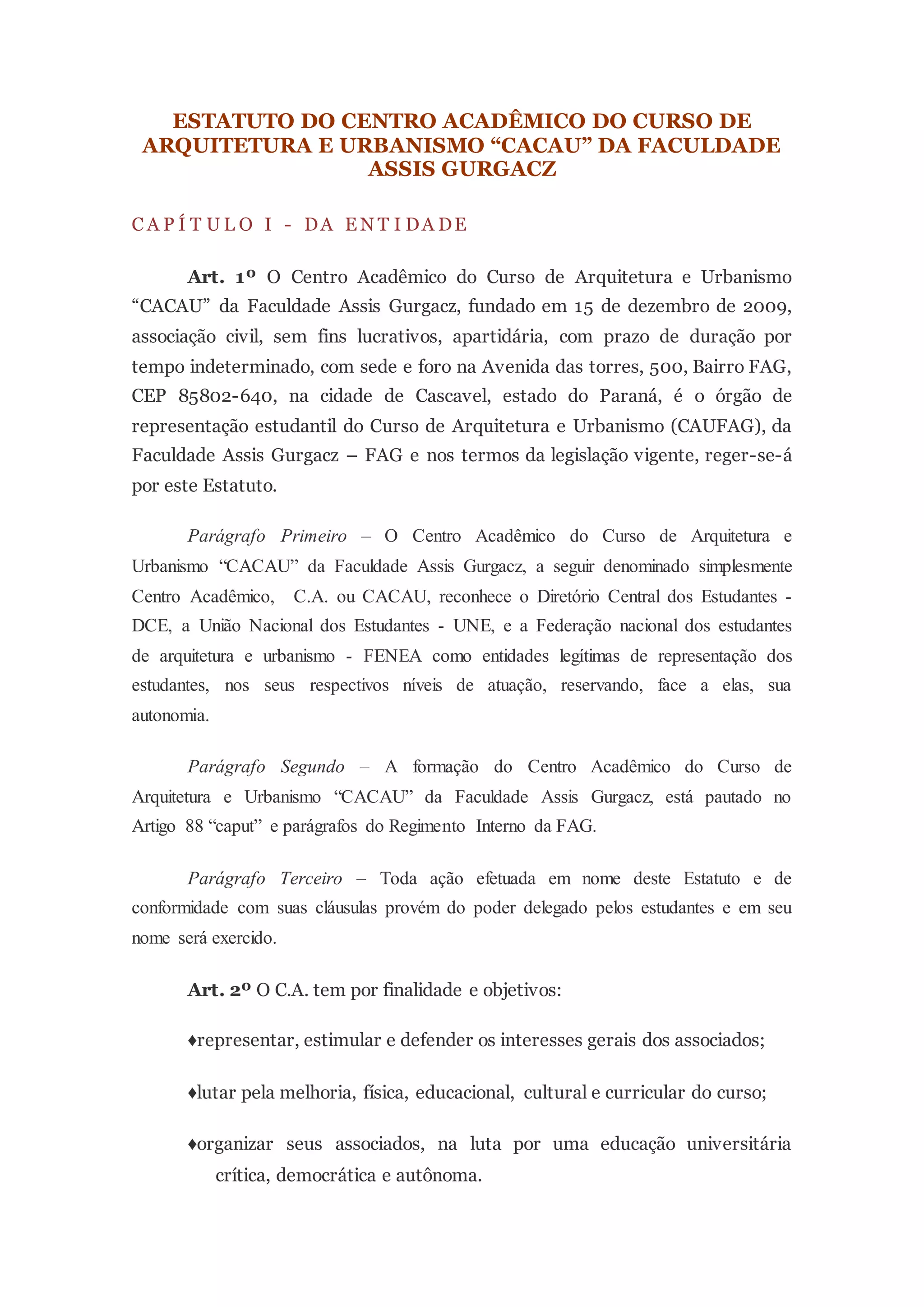 Este documento define o estatuto do Centro Acadêmico do Curso de Arquitetura e Urbanismo "CACAU" da Faculdade Assis Gurgacz. Ele estabelece que o CACAU representa os estudantes do curso, define seus objetivos e estrutura organizacional, incluindo a diretoria eleita e as assembléias gerais. Além disso, descreve os direitos e deveres dos associados, o processo eleitoral e disposições gerais sobre reformas estatutárias.