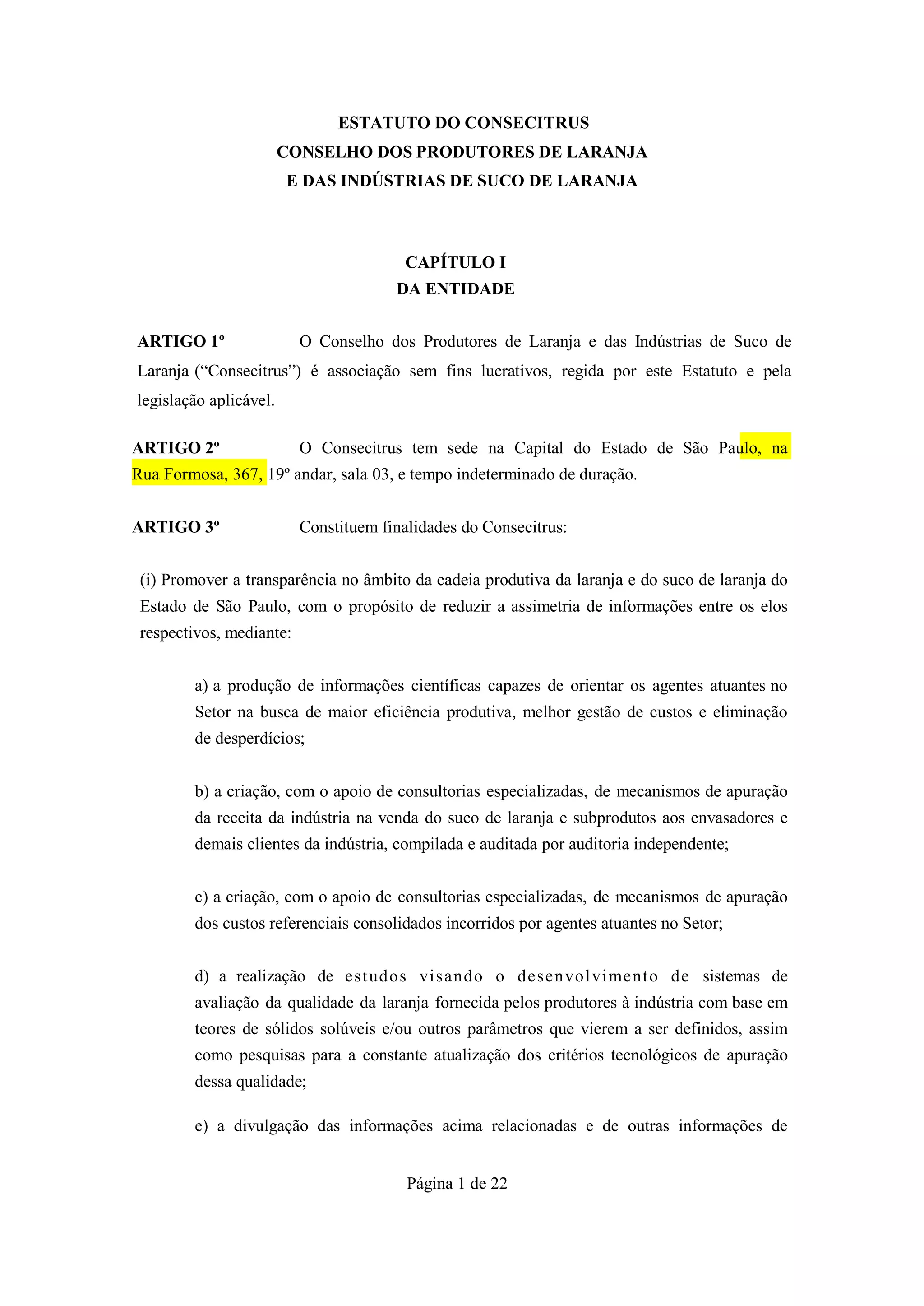 Este documento descreve o estatuto do Conselho dos Produtores de Laranja e das Indústrias de Suco de Laranja (Consecitrus). O Consecitrus tem como objetivos promover a transparência na cadeia produtiva da laranja e do suco de laranja em São Paulo e estabelecer mecanismos e índices para avaliação da qualidade da laranja, custos de produção e preços de referência. O Conselho é composto por 6 membros indicados pelos associados fundadores CitrusBR e Sociedade Rural Brasileira.