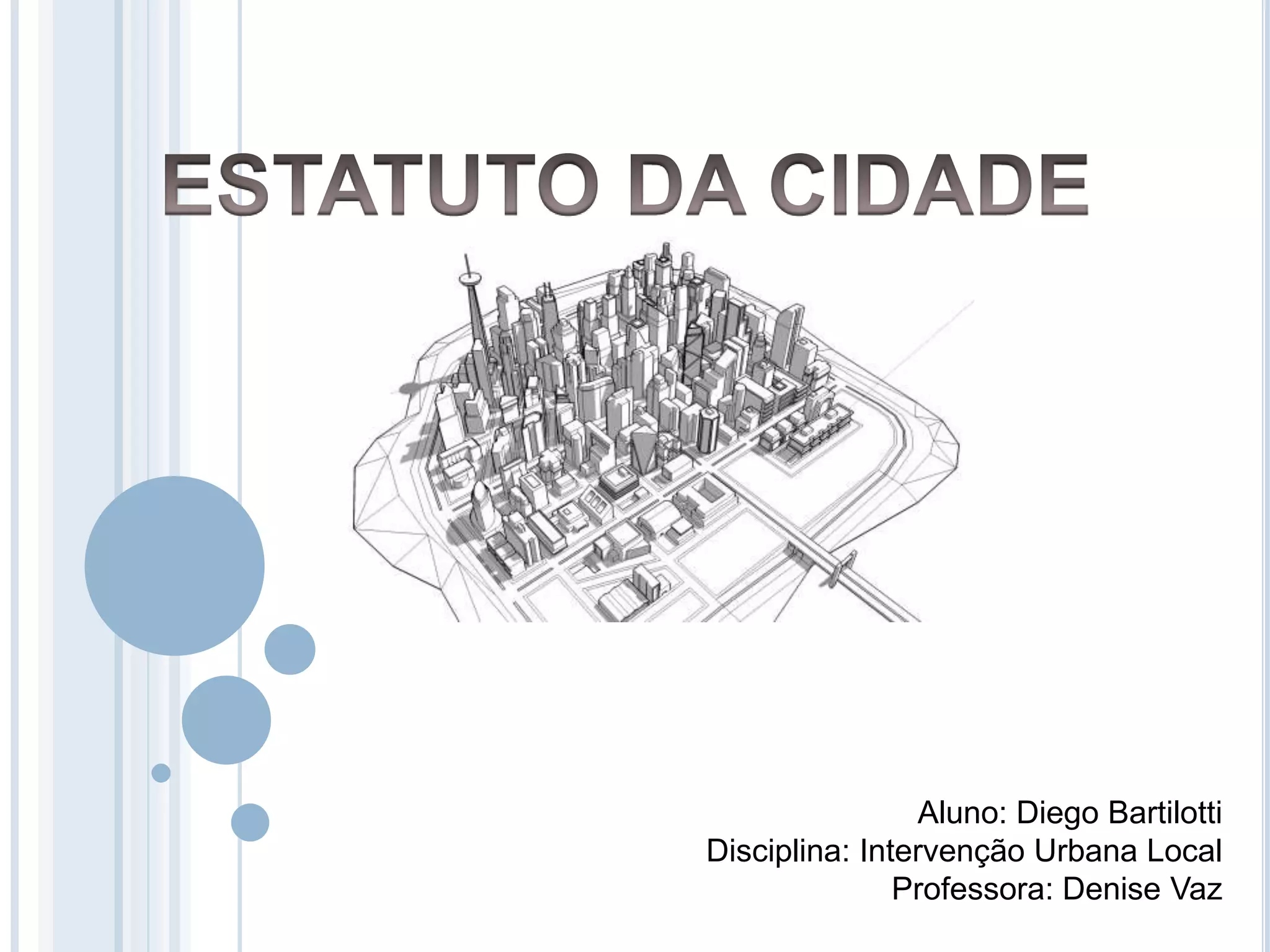 Este documento descreve a Lei no 10.257 de 2001, conhecida como Estatuto da Cidade, que regulamenta as diretrizes gerais da política urbana brasileira. A lei estabelece instrumentos como plano diretor, zoneamento, operações urbanas consorciadas e estudo de impacto de vizinhança para promover o uso social da propriedade urbana e o desenvolvimento sustentável das cidades.