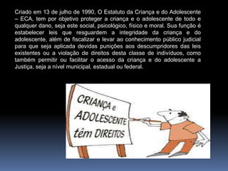 O documento discute o Estatuto da Criança e do Adolescente (ECA), lei brasileira de 1990 que protege os direitos das crianças e adolescentes. O ECA estabelece leis para proteger crianças e adolescentes de danos e assegurar seu acesso à justiça, além de proibir punições físicas.