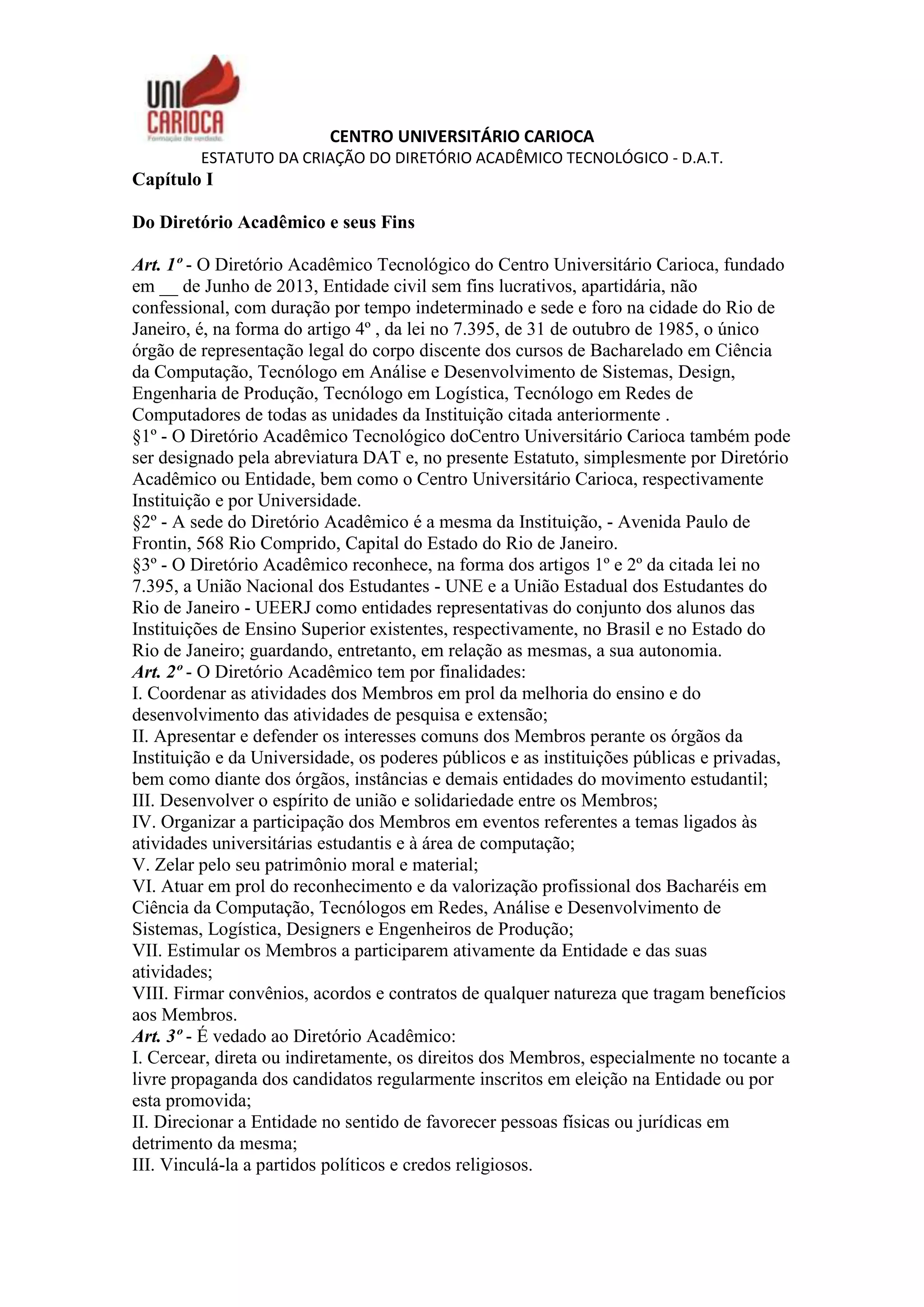 Este documento estabelece o estatuto para a criação do Diretório Acadêmico Tecnológico (DAT) do Centro Universitário Carioca. O DAT representará os alunos dos cursos de Ciência da Computação, Análise e Desenvolvimento de Sistemas, Design, Engenharia de Produção, Logística e Redes de Computadores. O estatuto define a organização, órgãos, membros, direitos, deveres e atribuições do DAT.