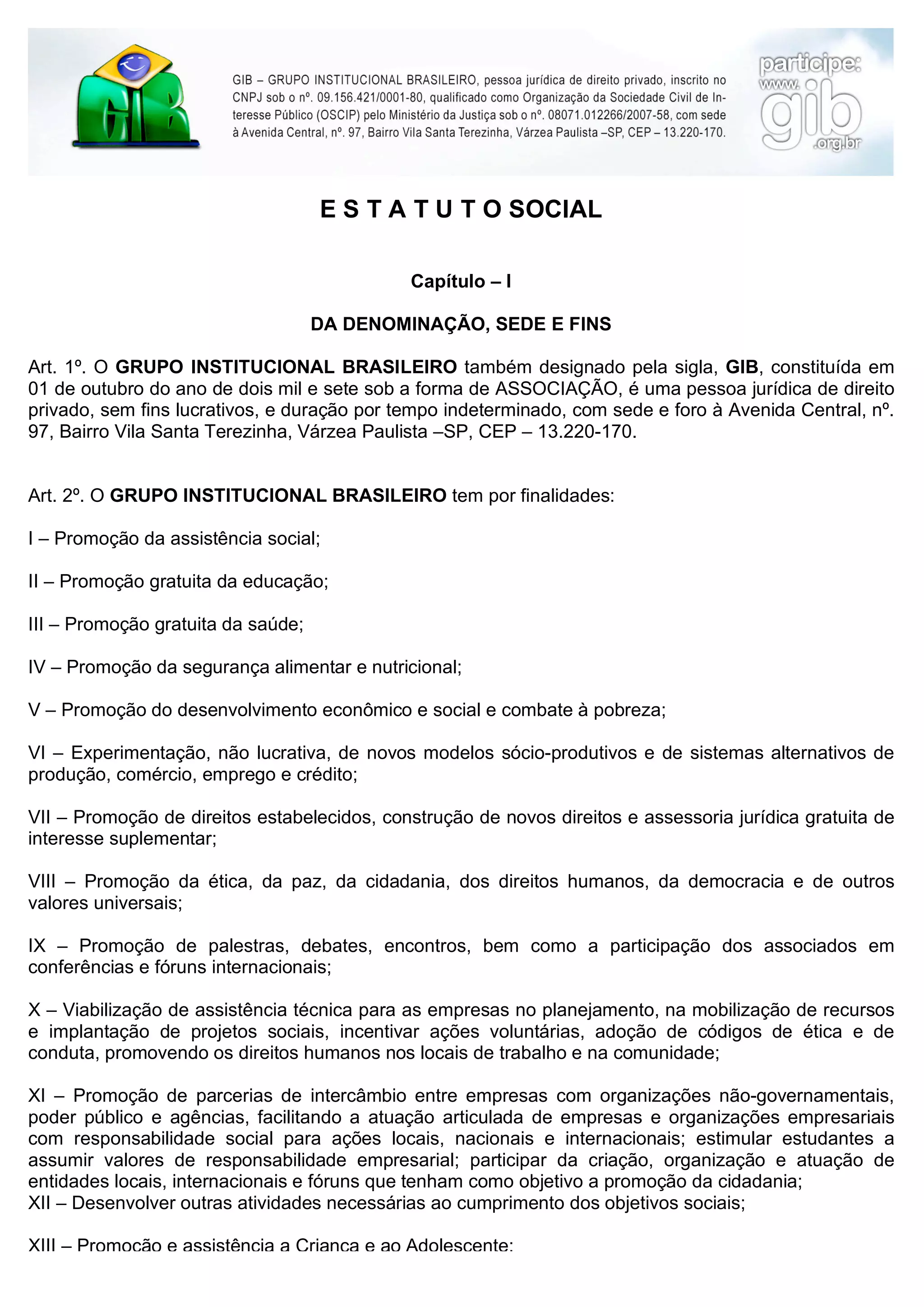 I. O documento descreve o estatuto de uma associação sem fins lucrativos chamada GRUPO INSTITUCIONAL BRASILEIRO, estabelecendo suas finalidades, organização e administração.
