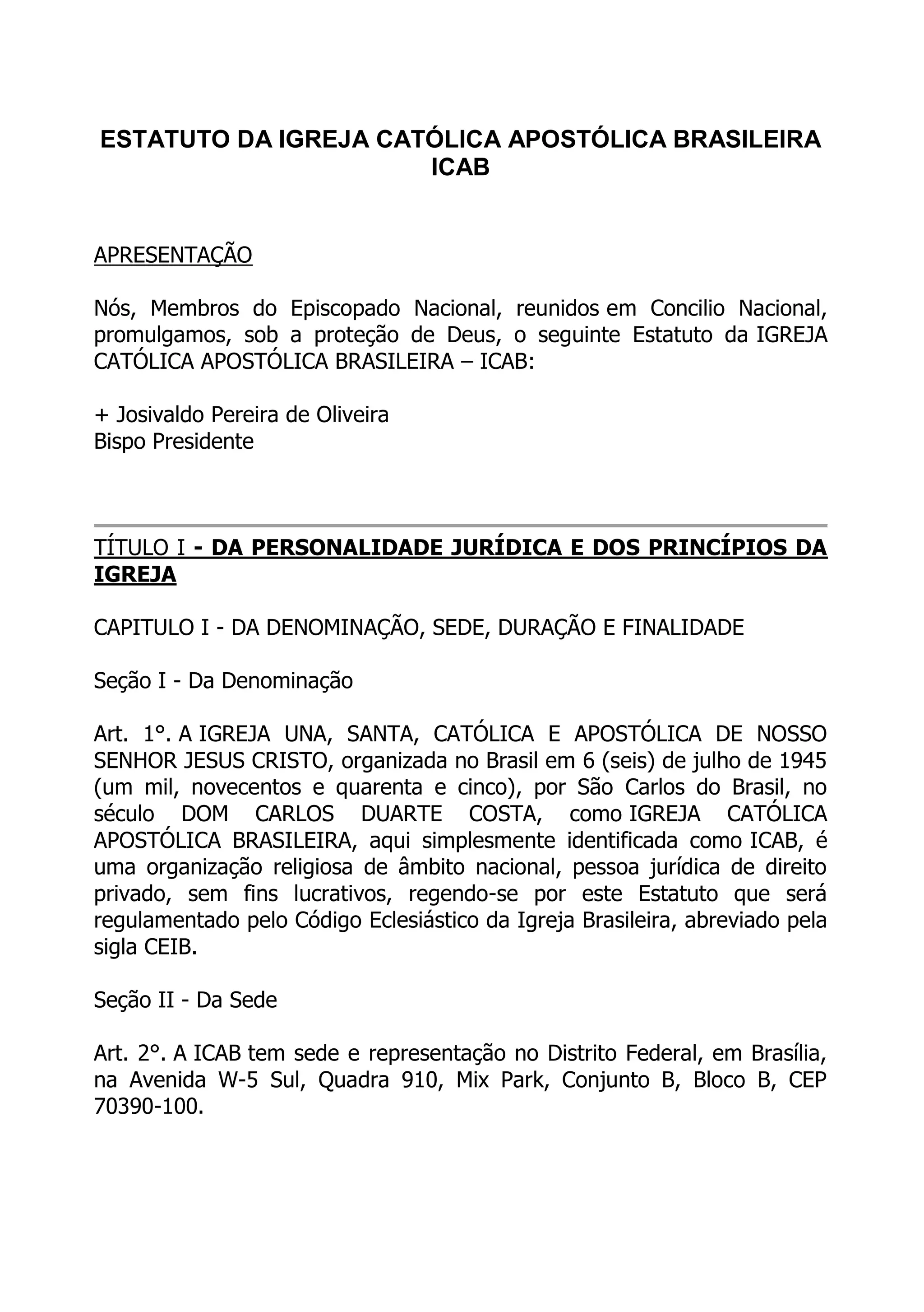 Este documento apresenta o Estatuto da Igreja Católica Apostólica Brasileira (ICAB), definindo sua denominação, sede, duração, finalidades, princípios, composição, direitos e deveres de seus membros. O Estatuto estabelece normas sobre a admissão e exclusão de fiéis e clérigos, além de tratar do patrimônio e recursos financeiros da Igreja.