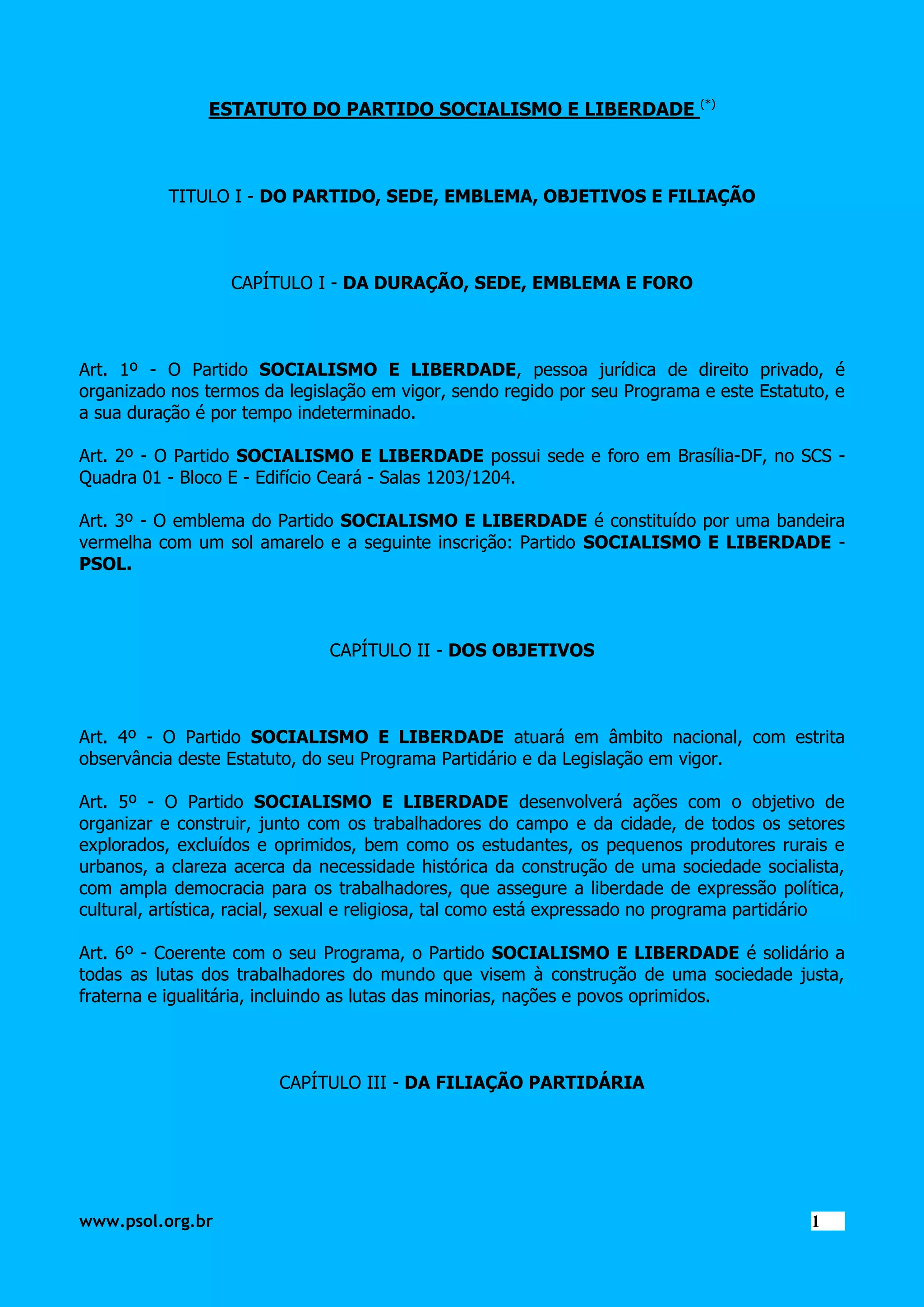 O documento apresenta o estatuto do Partido Socialismo e Liberdade (PSOL), definindo sua sede, emblema e objetivos, bem como as regras de filiação, direitos, deveres e disciplina partidária. O estatuto estabelece a organização do partido em nível nacional, estadual e municipal, com o objetivo de promover o debate democrático e a unidade na diversidade de opiniões entre os filiados.